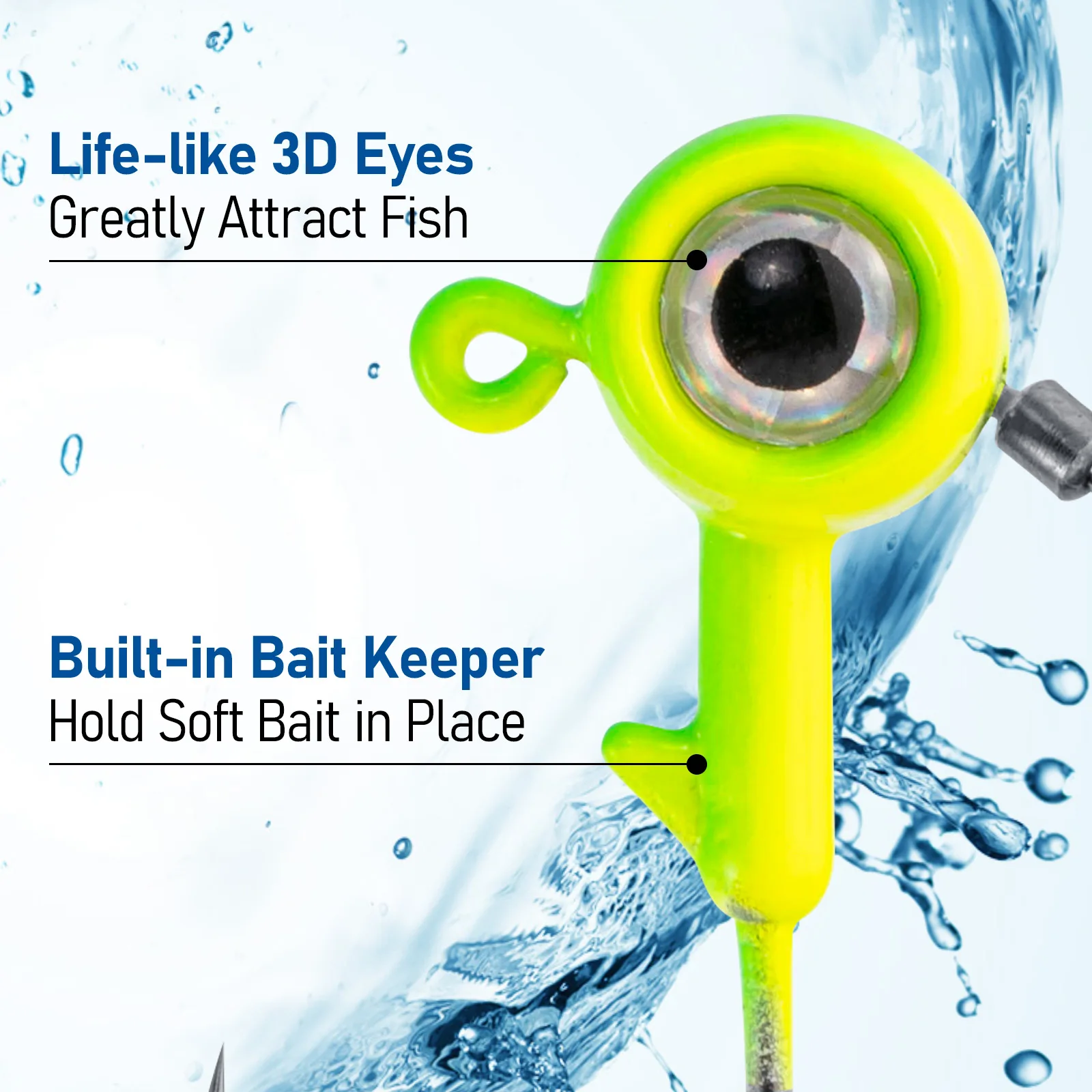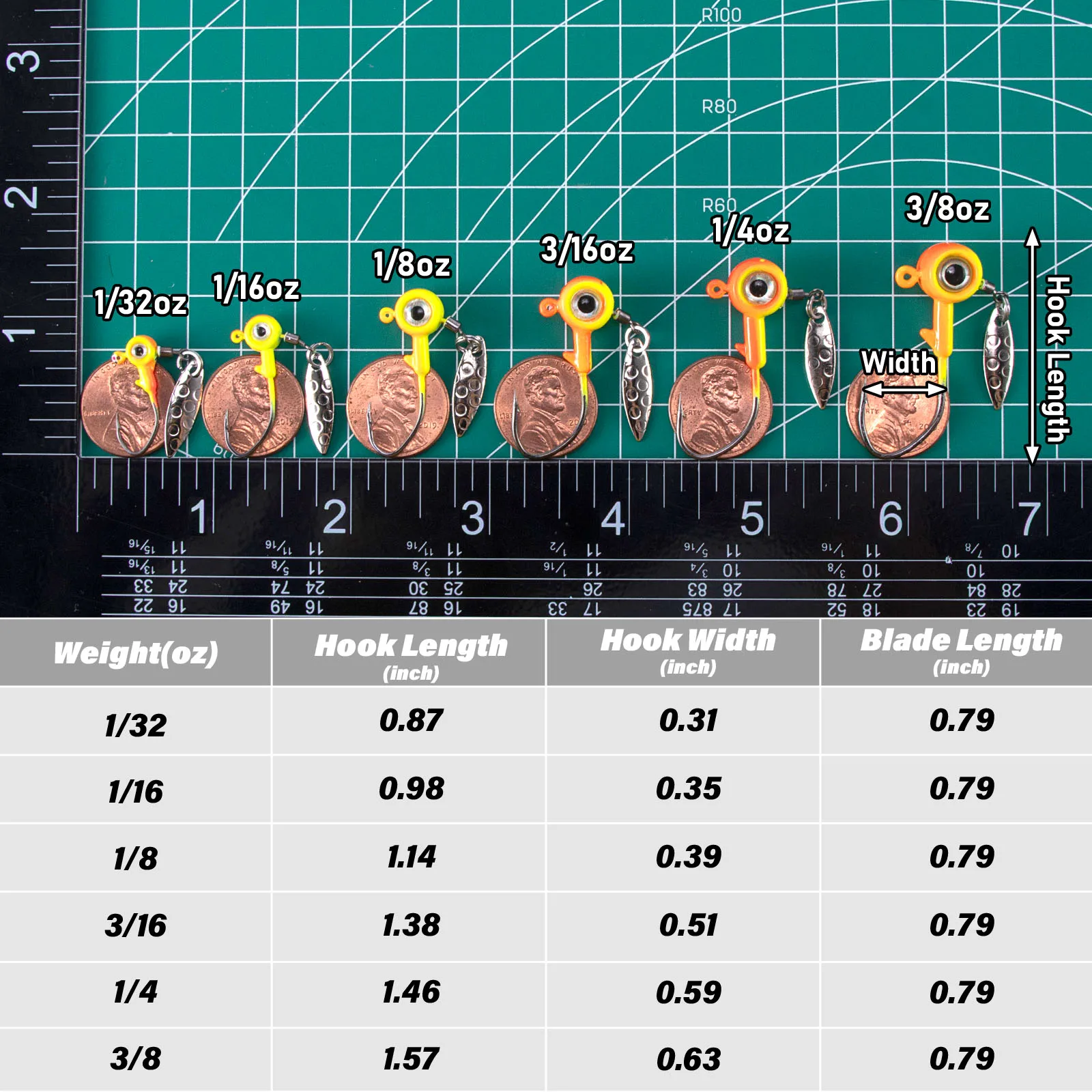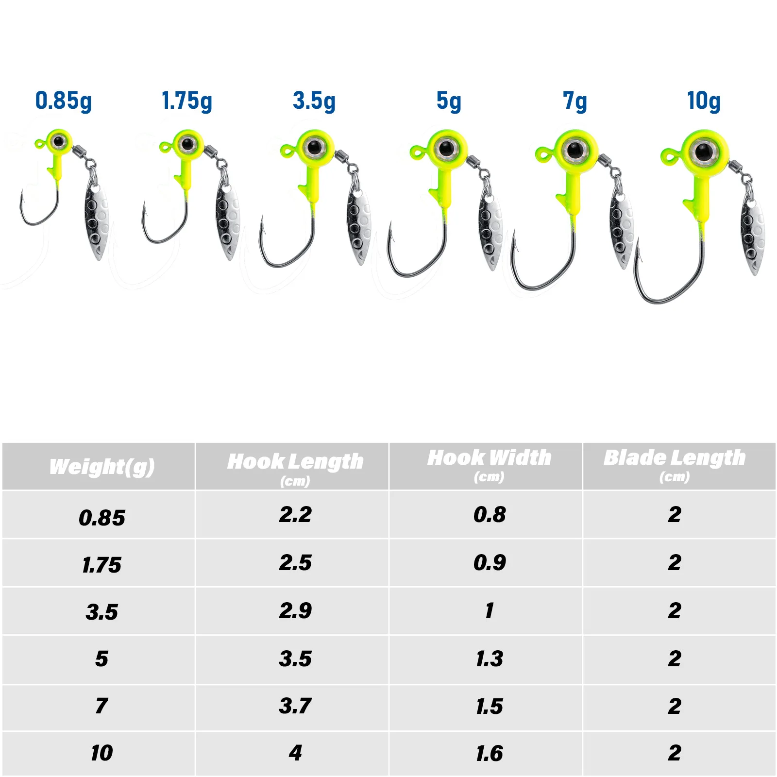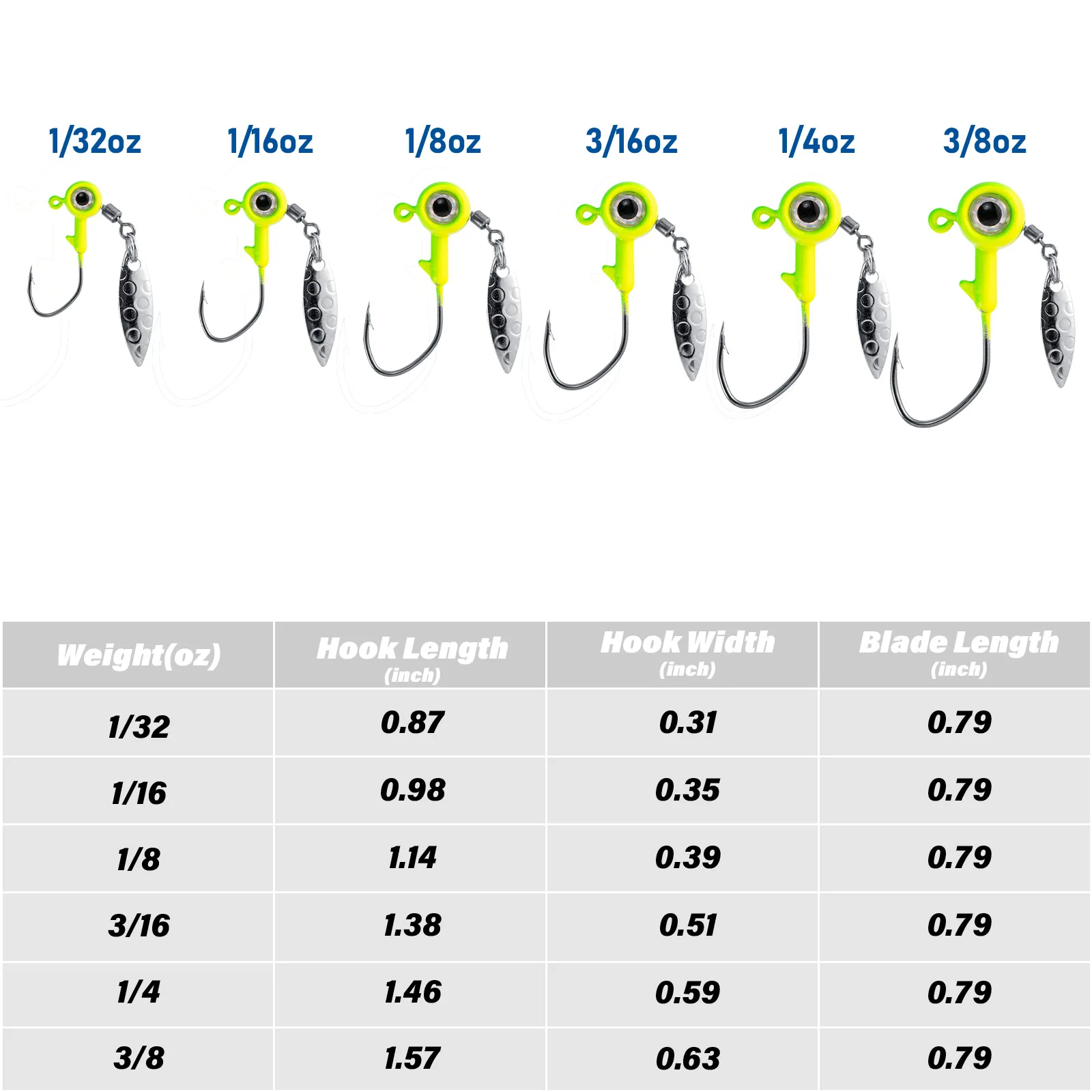 5.Cantidad: Paquete de 10; Tamaño: 1/32 oz; 1/16 oz; 1/8 oz; 3/16 oz; 1/4 oz; 3/8 oz; 2/5 oz; 1/2 oz. Perfecto para capturar una variedad de peces depredadores de boca pequeña, como perca, tipo de pez, bluegill, trucha y lubina blanca, etc.