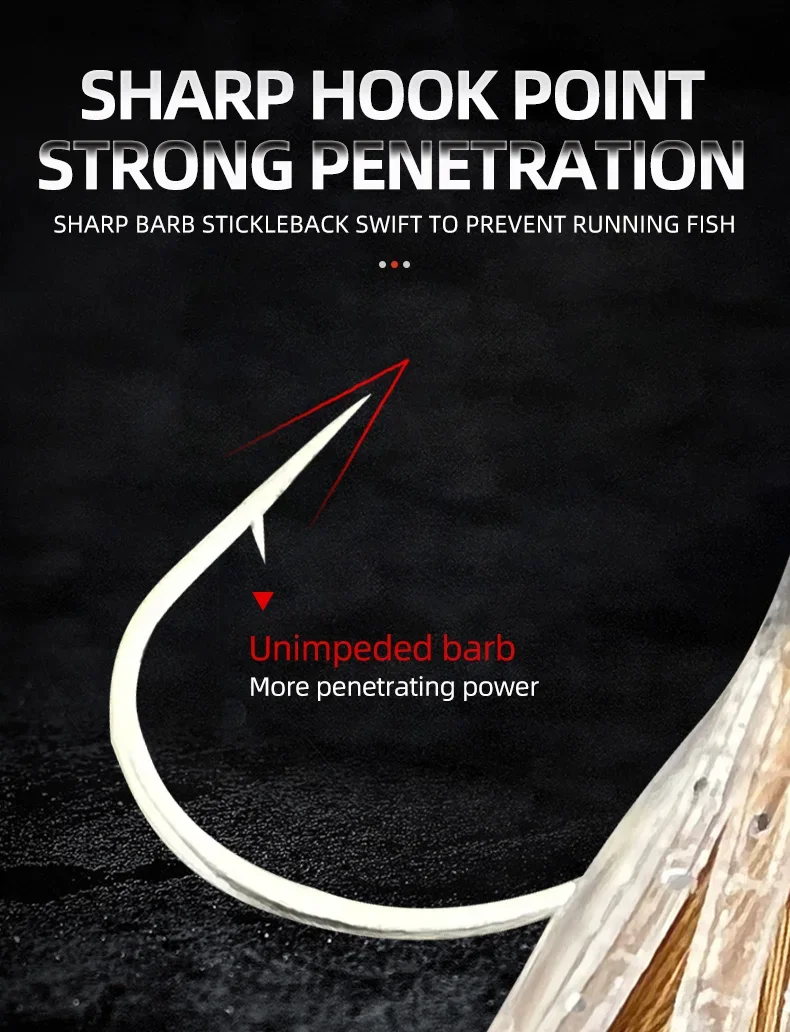 【Anzuelos de pesca afilados】:La plataforma de cebo de pesca cuenta con 5 anzuelos, anzuelos de acero con alto contenido de carbono, duraderos y resistentes a la corrosión. El diseño de anzuelos afilados y de púas garantiza una mejor penetración y no se escapa de peces. Adecuado para capturar percas blancas, maquineras, lugares, corredores y bagres, etc.