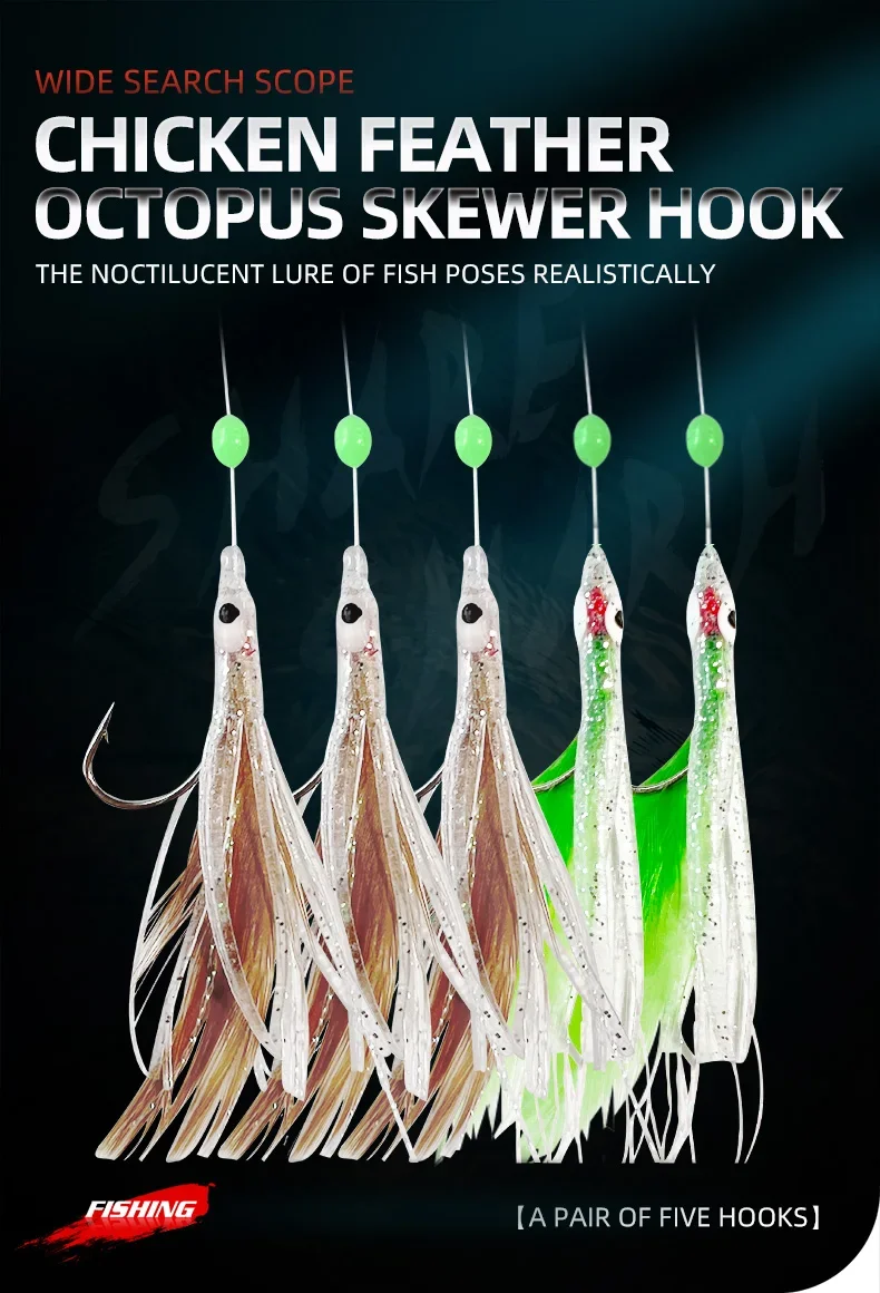 Plumas luminosas de caballa de pulpo, aparejos de cebo Sabiki con ganchos de cuerda, señuelos, pesca en mar y calamar, aparejos de aparejos de maratón