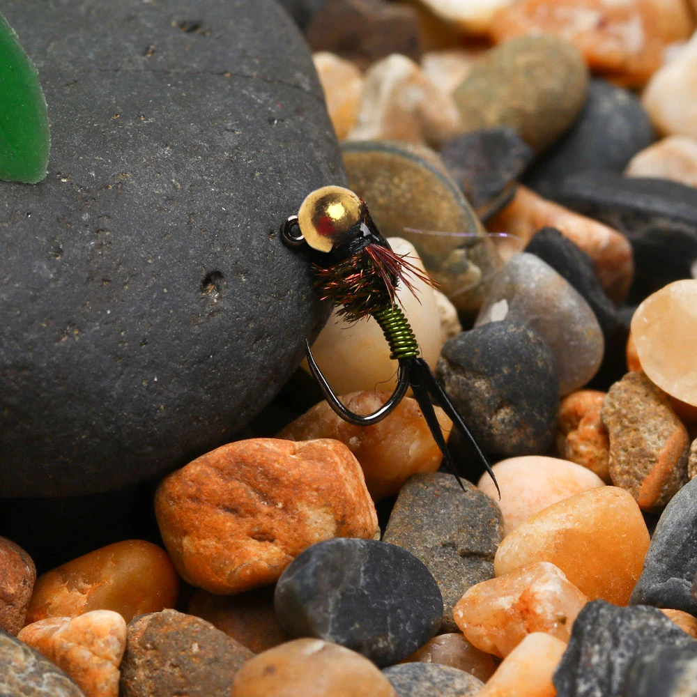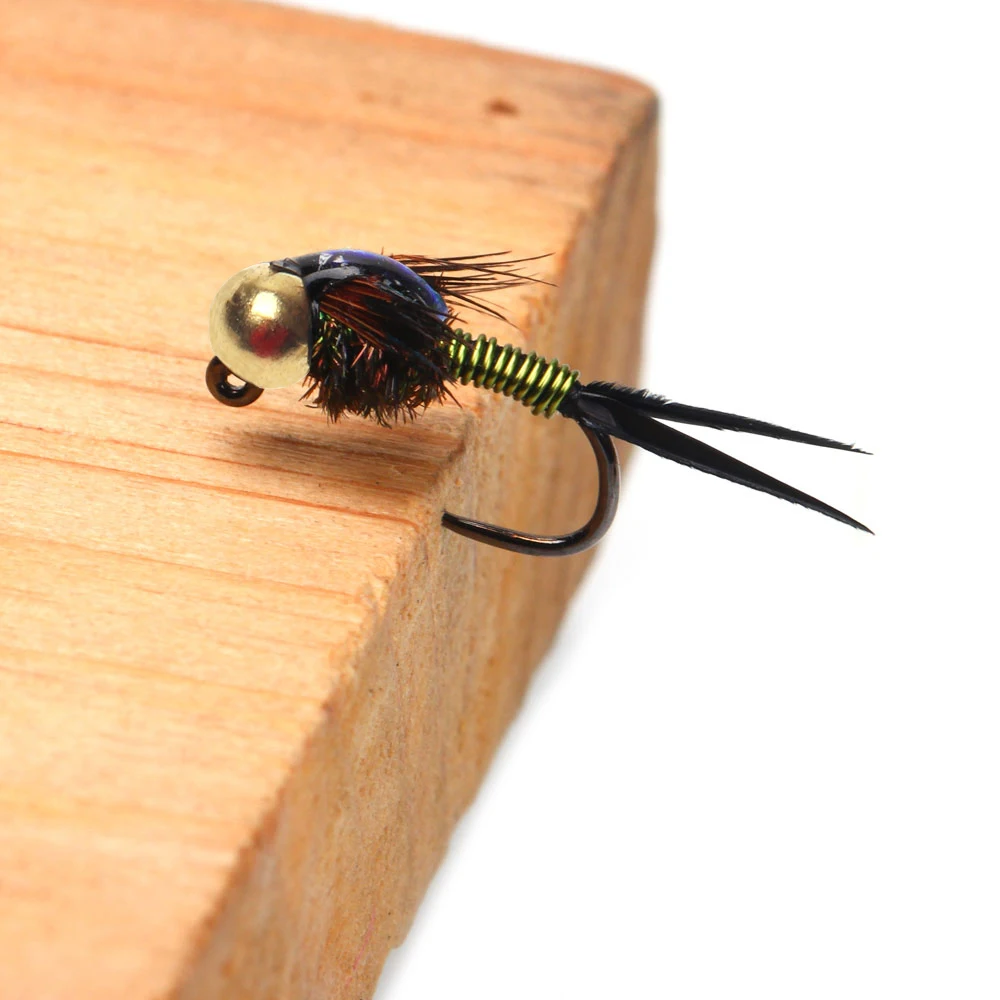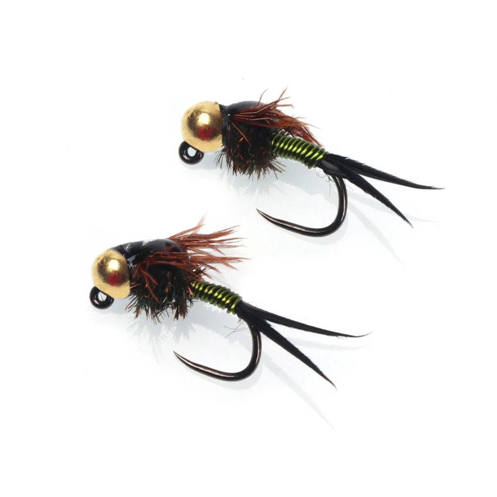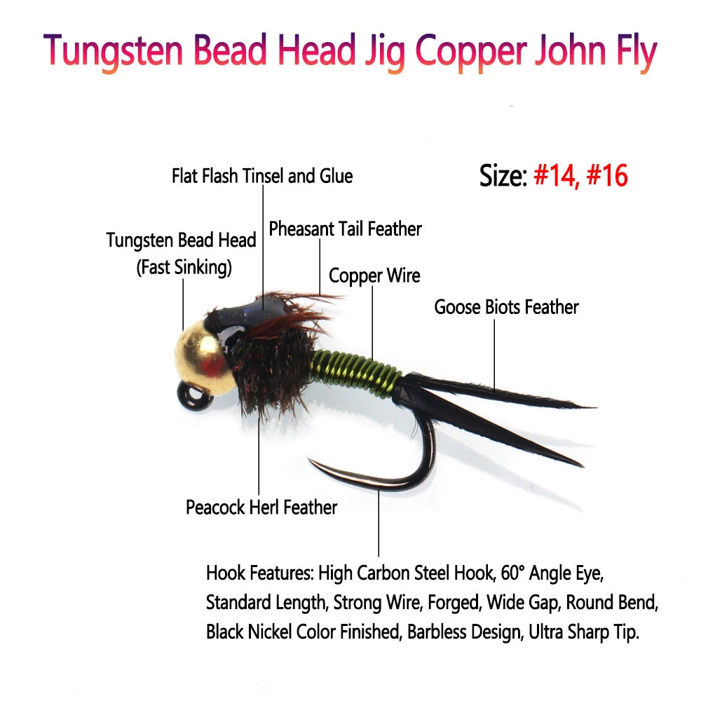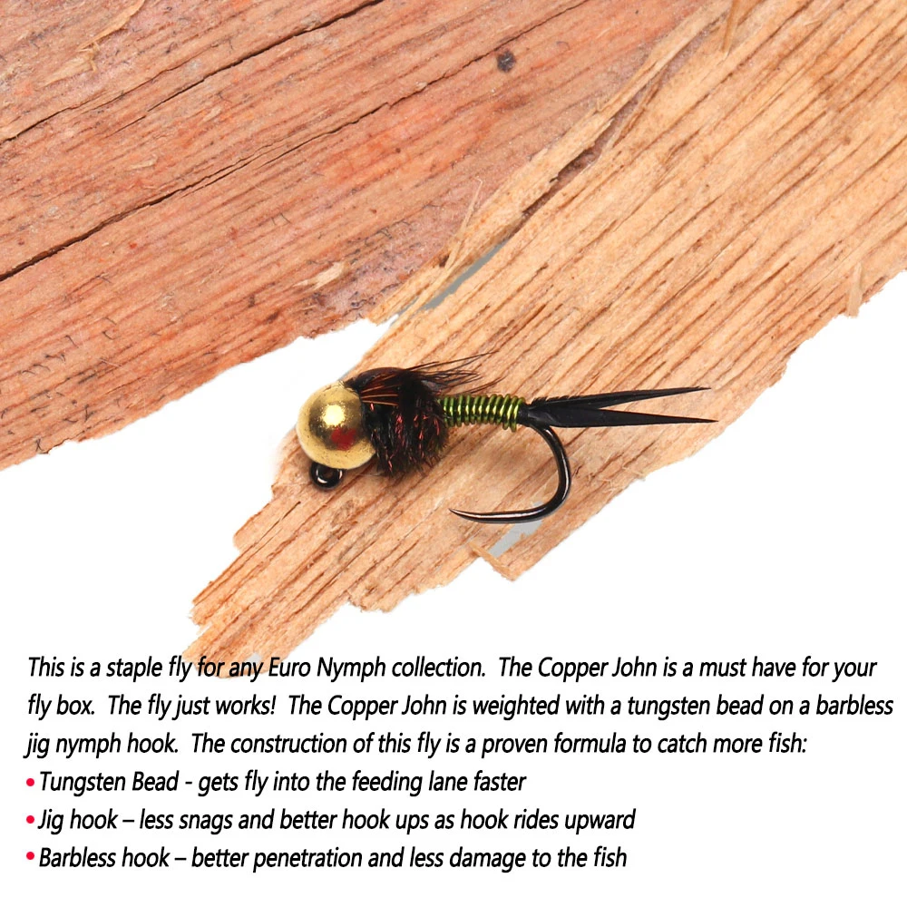 Esta es una mosca básica para cualquier colección Euro Nymph.El Copper John es imprescindible para tu caja de moscas.¡La mosca simplemente funciona!El Copper John tiene un peso de una cuenta de tungsteno sobre un anzuelo de ninfa sin barblas.La construcción de esta mosca es una fórmula probada para capturar más peces: