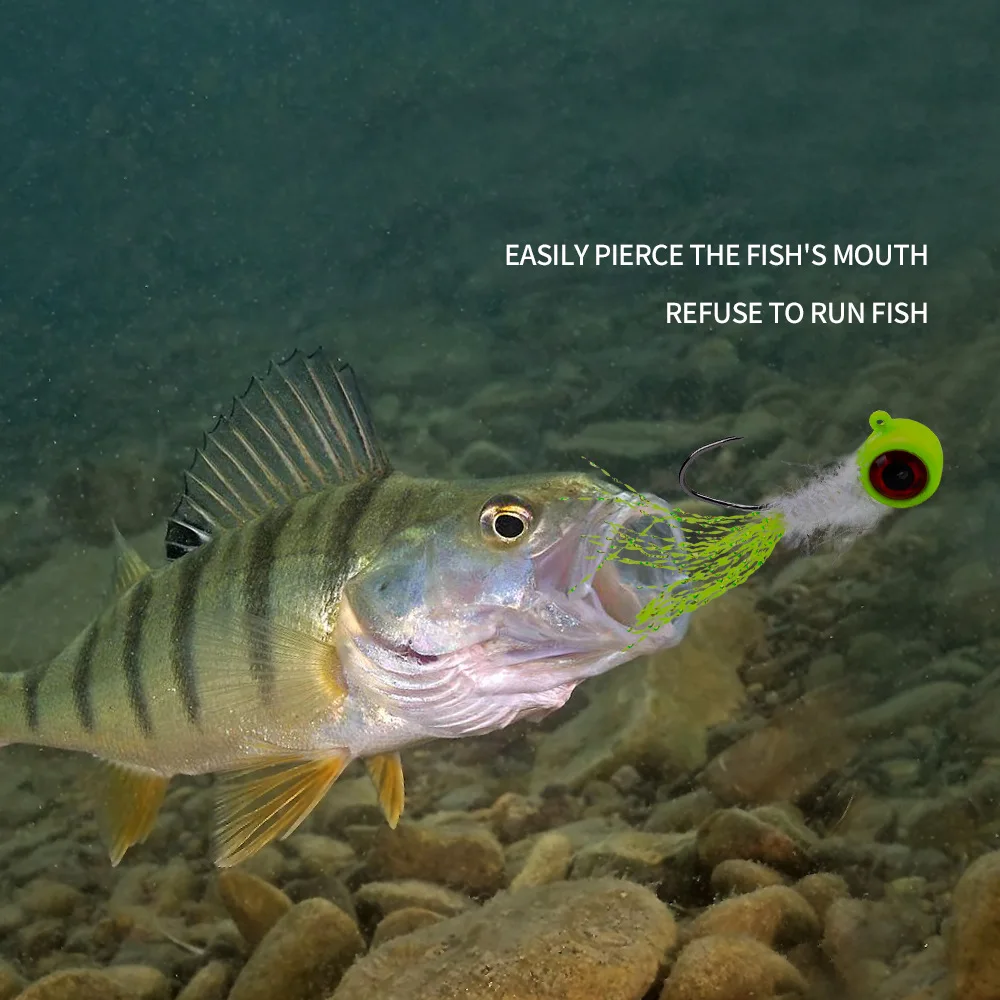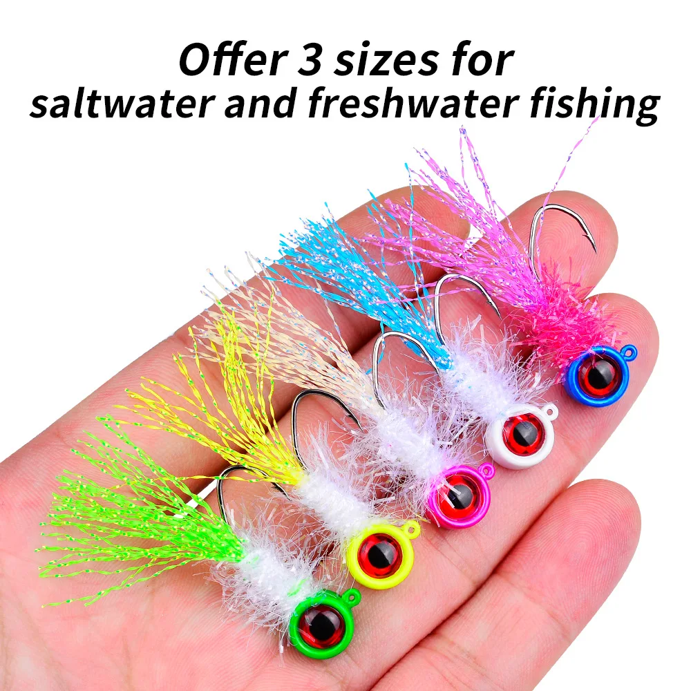 5 piezas Bucktail Jigs cabeza gancho 3D ojos cebo 1g 2g pelo de ciervo pluma gancho barba Jigging señuelo pesca