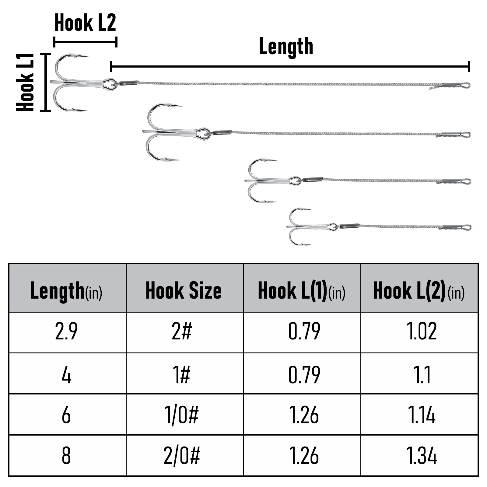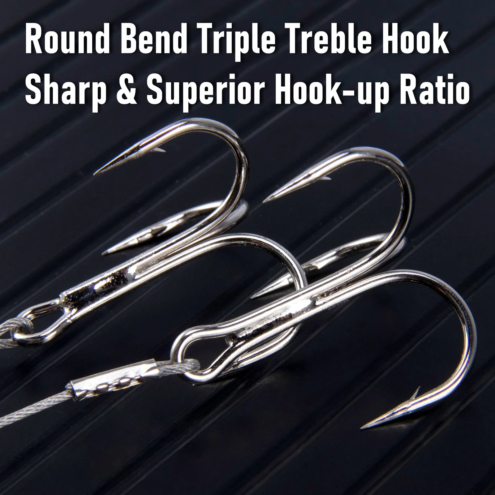 Estos anzuelos triples cuentan con una punta de aguja súper afilada.Diseñado para permanecer más afilado por más tiempo, asegurando anzuelos efectivos y minimizando la posibilidad de que un pez se escape.