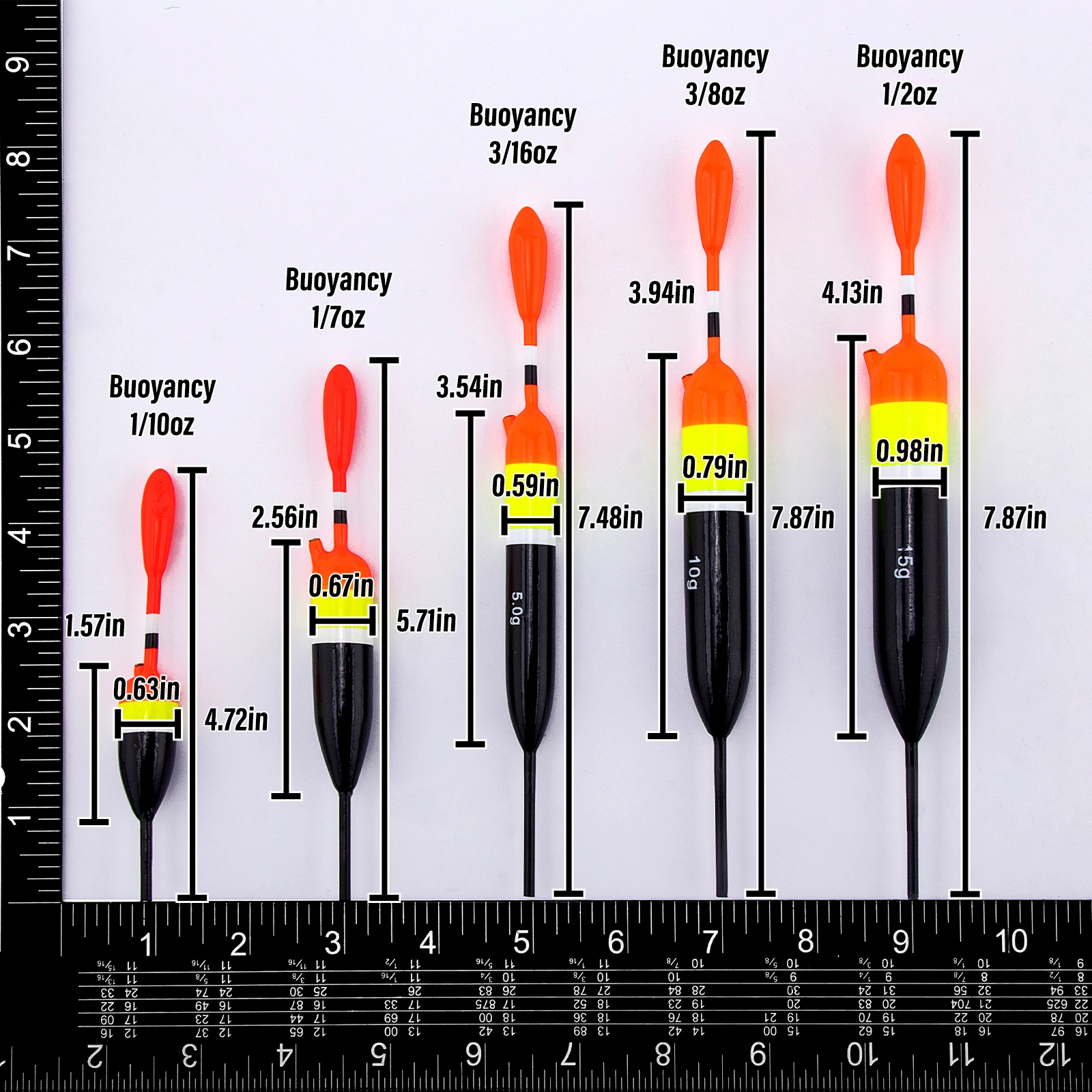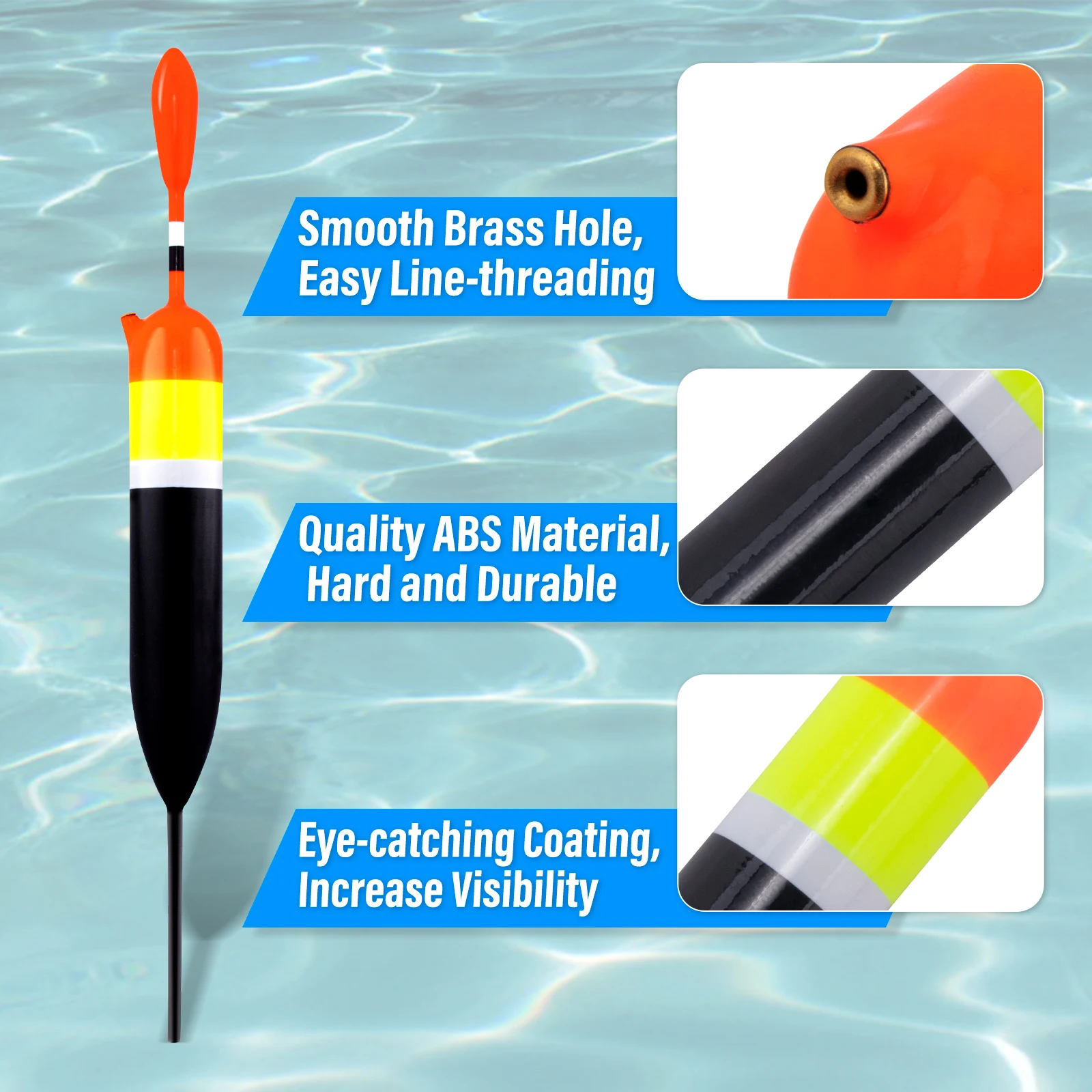 El flotador de pesca está hecho de material ABS y recubierto con una pintura impermeable y altamente visible.Los flotadores brillantes hacen que sea más fácil ver cuando los peces muestran el anzuelo.