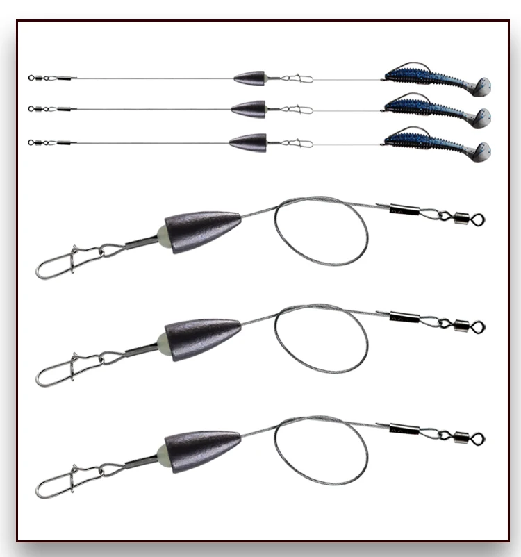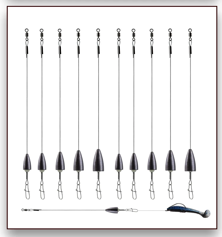 1.These Carolina-rigs are ready to use any time you need them without the time and trouble of tying up your own.Completed with a Bullet sinker weight, a Superior quality stainless steel wire, a rolling swivel, a snap and a fishing bead.