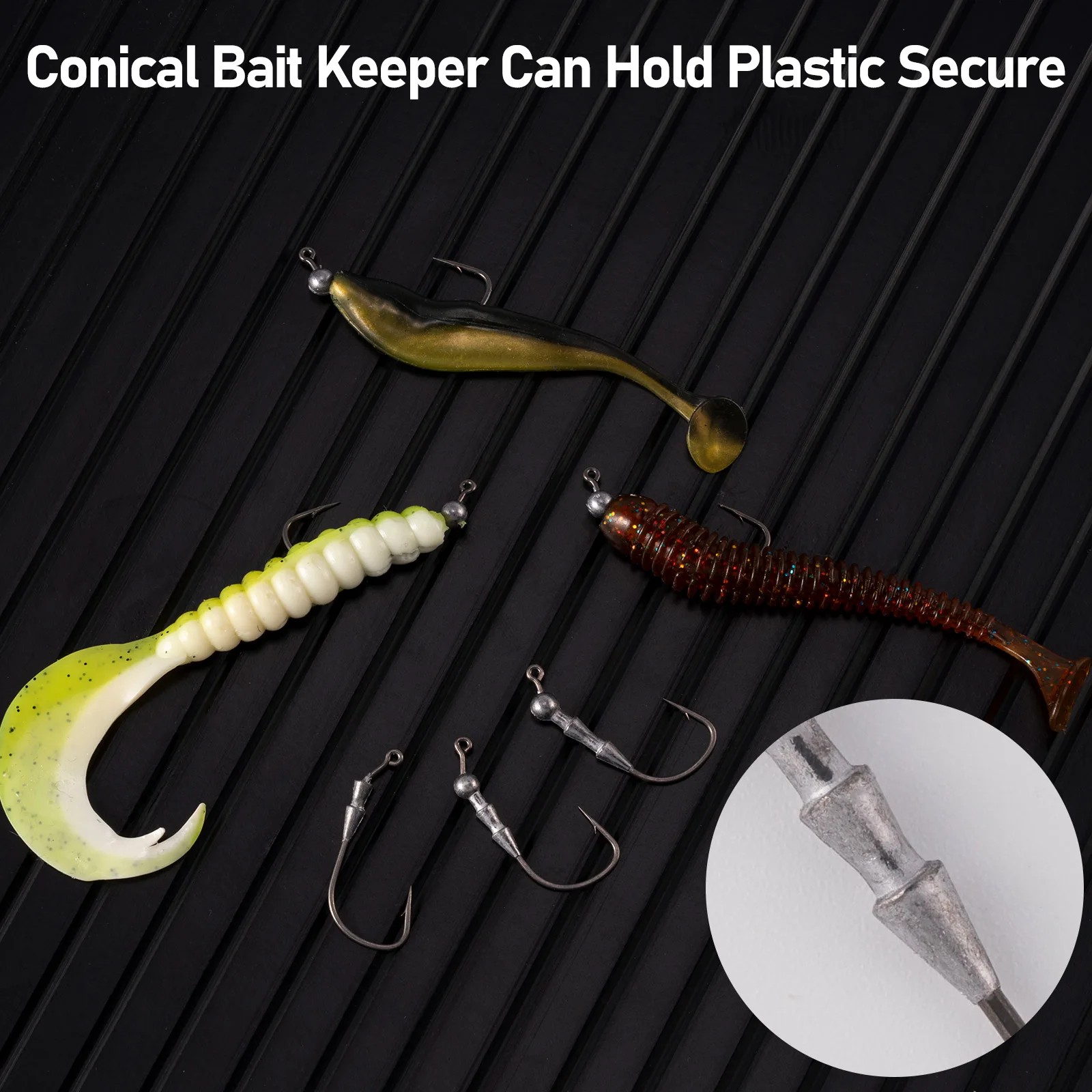 【Sostiene de forma segura el cebo de plástico】: la forma cónica del soporte de cebo está diseñada para sujetar el cebo de plástico de forma segura en su lugar, evitando que se resbale o se deslice del anzuelo.