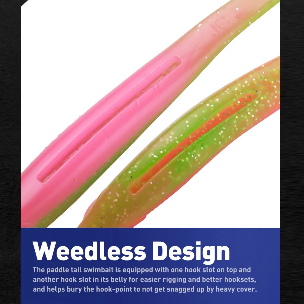* Diseño sin herramientas: el swimbait de cola de remo está equipado con una ranura para gancho en la parte superior y otra ranura para gancho en su vientre para un aparejo más fácil y mejores anzuelos, y ayuda a enterrar el punto del gancho para no engancharse por una cubierta pesada.