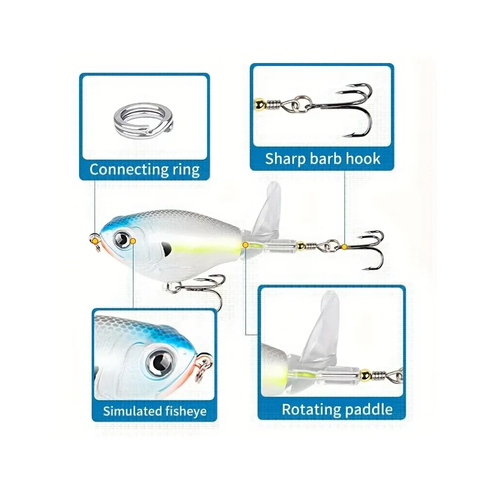 1.Movimiento de agua realista: Equipado con una boca cóncava de diseño exclusivo y hélices duales de 360 grados, este cebo de pesca crea salpicaduras realistas, imitando eficazmente las alteraciones naturales del agua para atraer peces.
