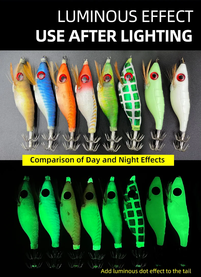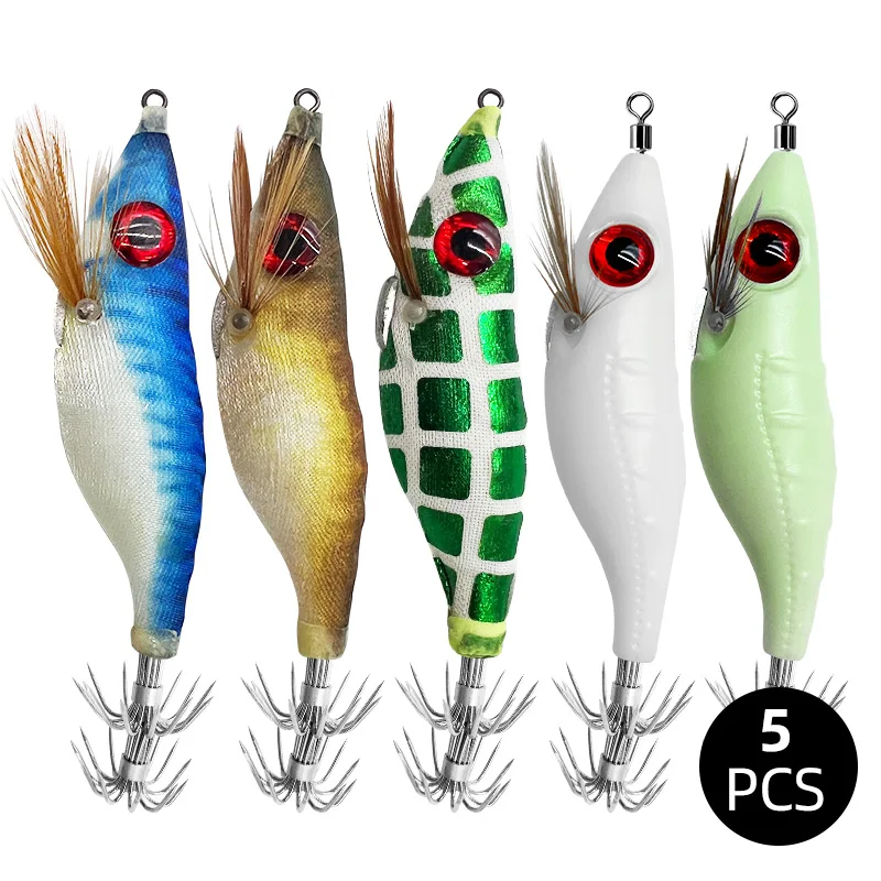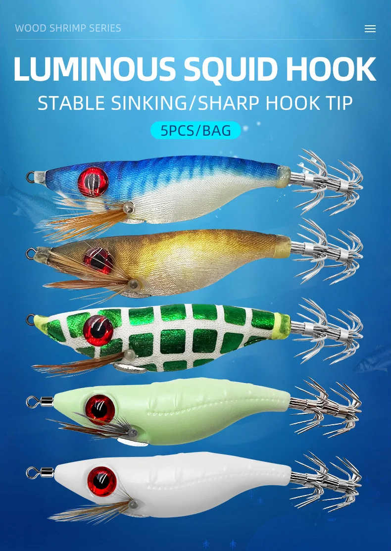 5 unids/bolsa envoltura luminosa camarones horizontales 10cm madera camarones calamar gancho vientre redondo camarones cebo señuelo falso cebo