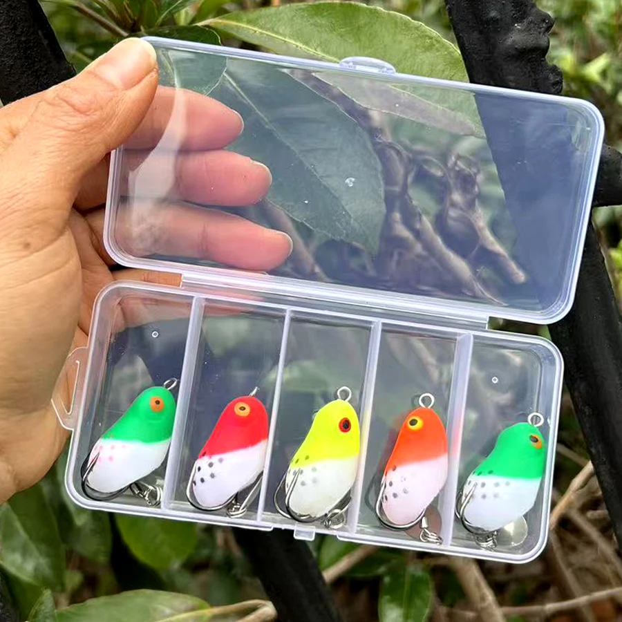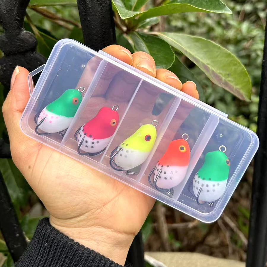 5 unids/caja superficie flotante Señuelos de pesca conjunto Mini trueno rana con lentejuelas ganchos dobles Swimbait para perca pez negro pez lubinaMarca: BODECINLongitud: 30 mm/1,18 pulgadasPeso: 4 gProfundidad de buceo: agua superficialis_customized: síTipo: señuelo de ranaMaterial: plástico suaveGanchos de calidad: 2 ganchos BKK fuertesPeixe objetivo: chub pálido, lubina, picos, carpa de control amarillo, perca china, culter de boca superior
