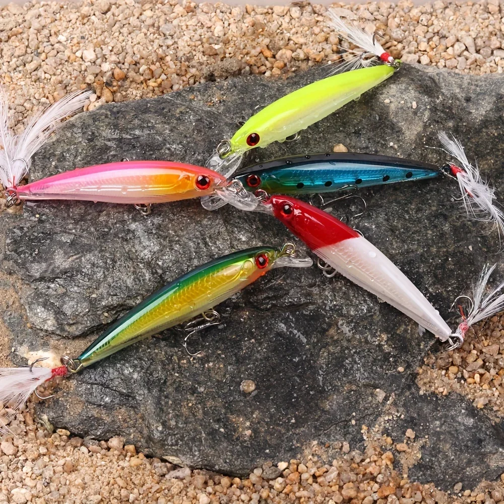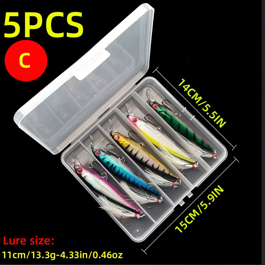 Lista de embalaje: 5 uds. Señuelos de pesca con 1 caja(El señuelo es de 2 tamaños, es de tamaño diferente, compruébelo cuando realice el pedido)