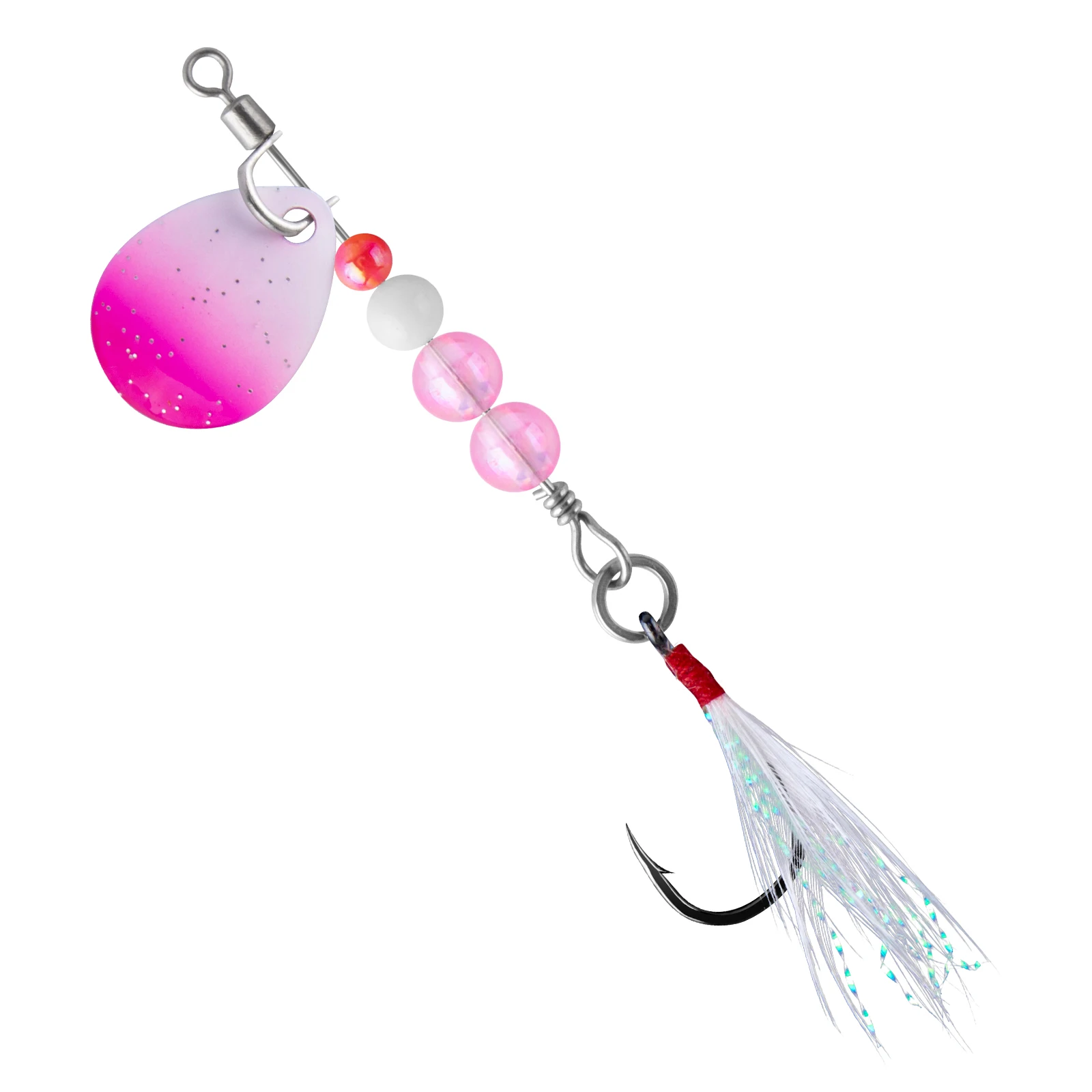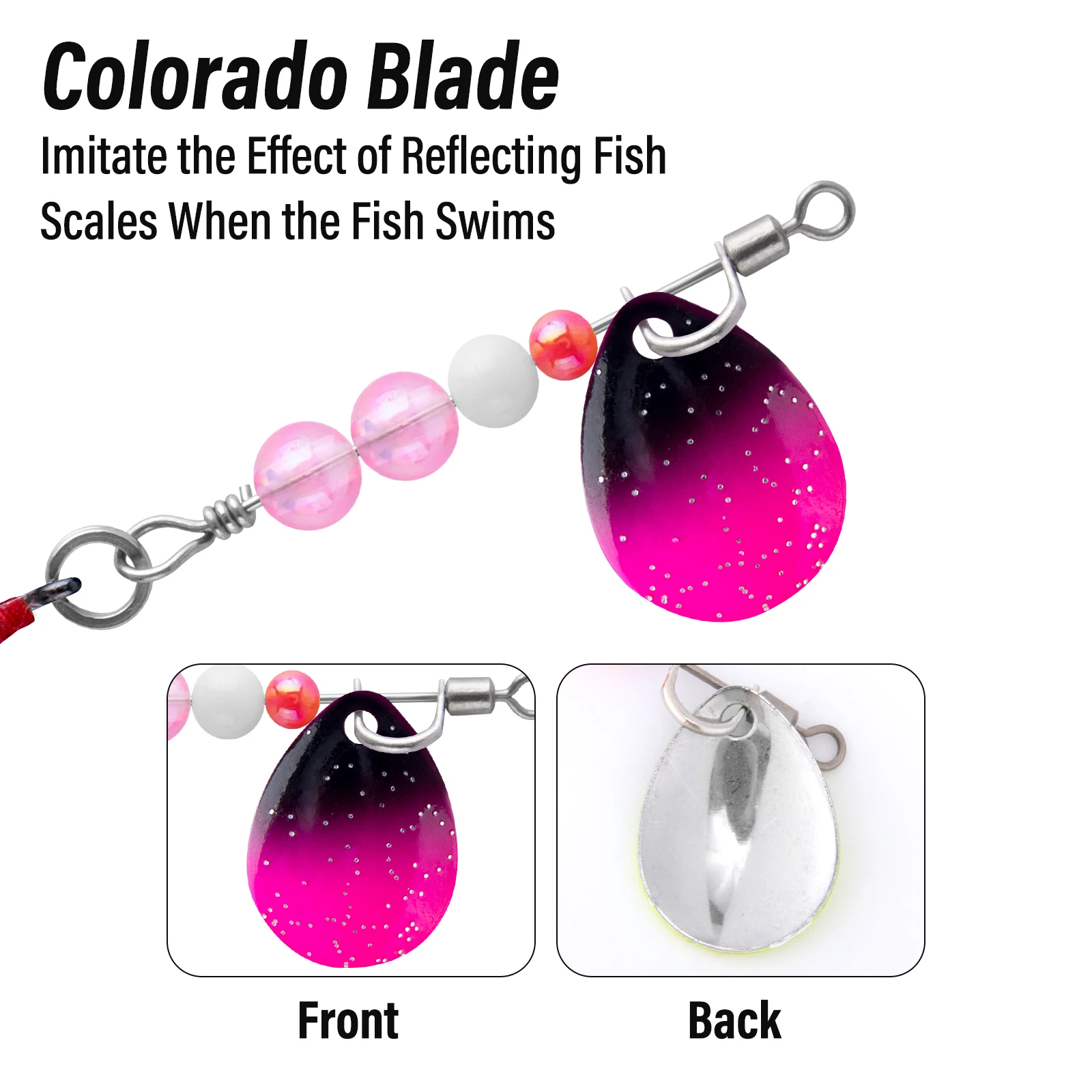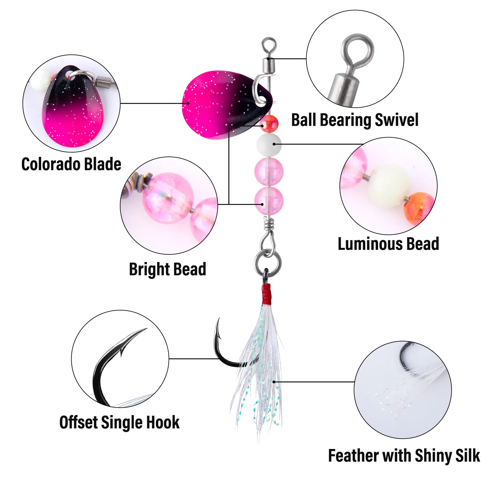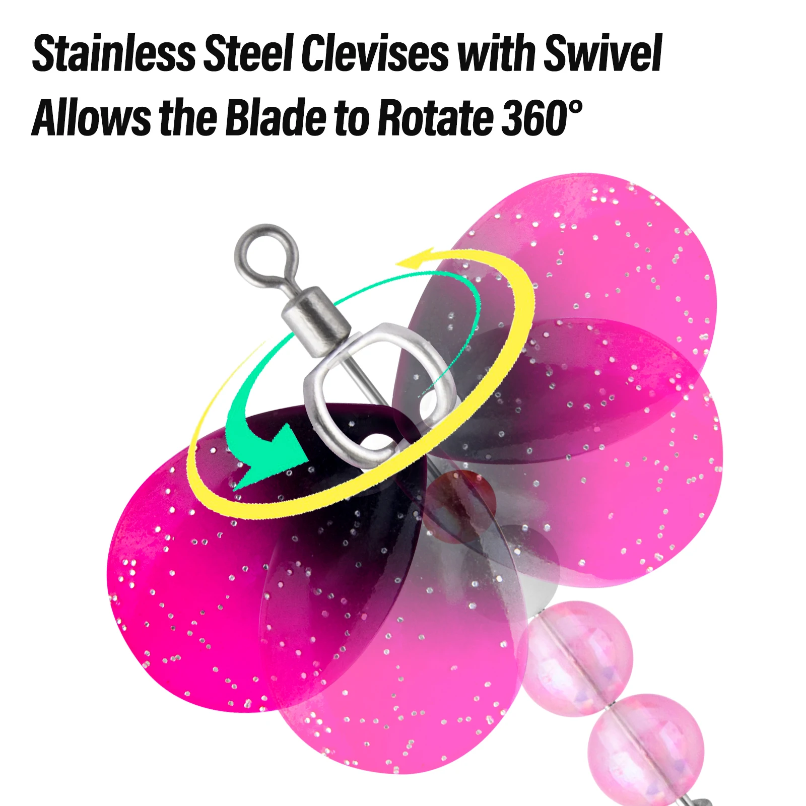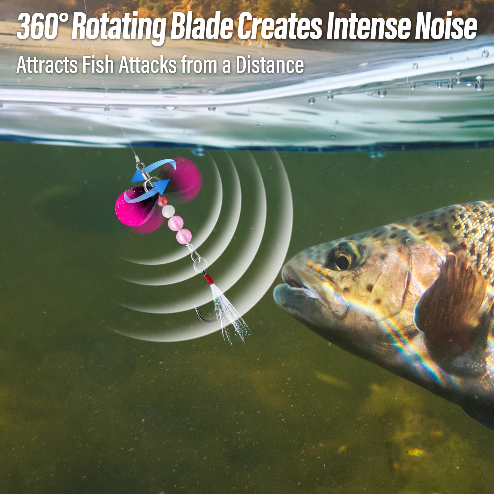 360° Cuchillas de destello de rotación libre: las cuchillas giratorias metálicas brillantes giran suavemente para crear destellos y vibraciones, imitando escamas de pescado para atraer peces depredadores como truchas, lubinas y percas.