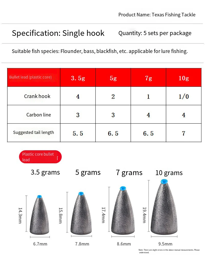 Tamaño más pesado: 3,5 g (1/8 oz); 5 g (1/5 oz), 7 g (1/4 oz); 10 g (1/3 oz) (se distinguir como peso de plomo)