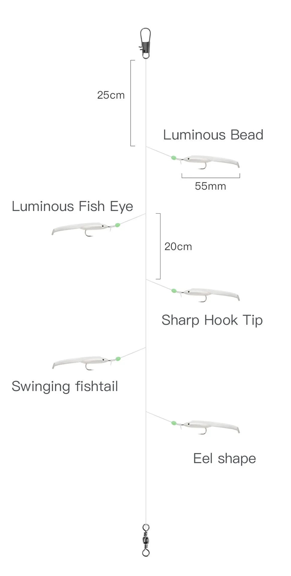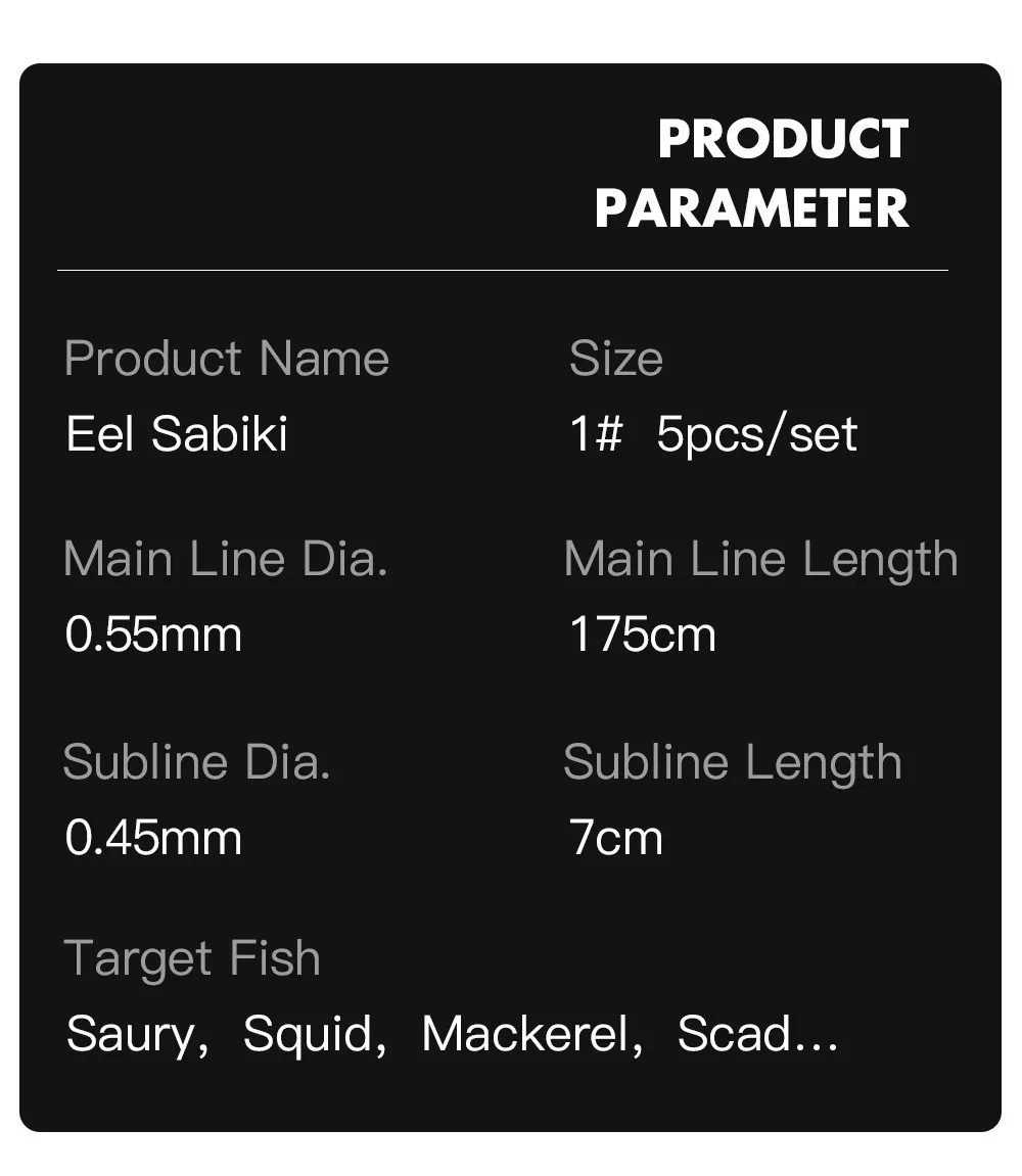 Información del productoNombre del producto: Eel SabikiTamaño del gancho: 1#Señuelo: Señuelo suave de anguilaPaquete: Bolsa de plásticoMás detalles se encuentran en las siguientes imágenes.