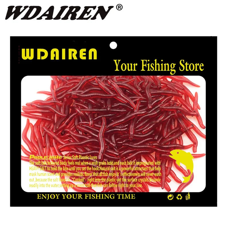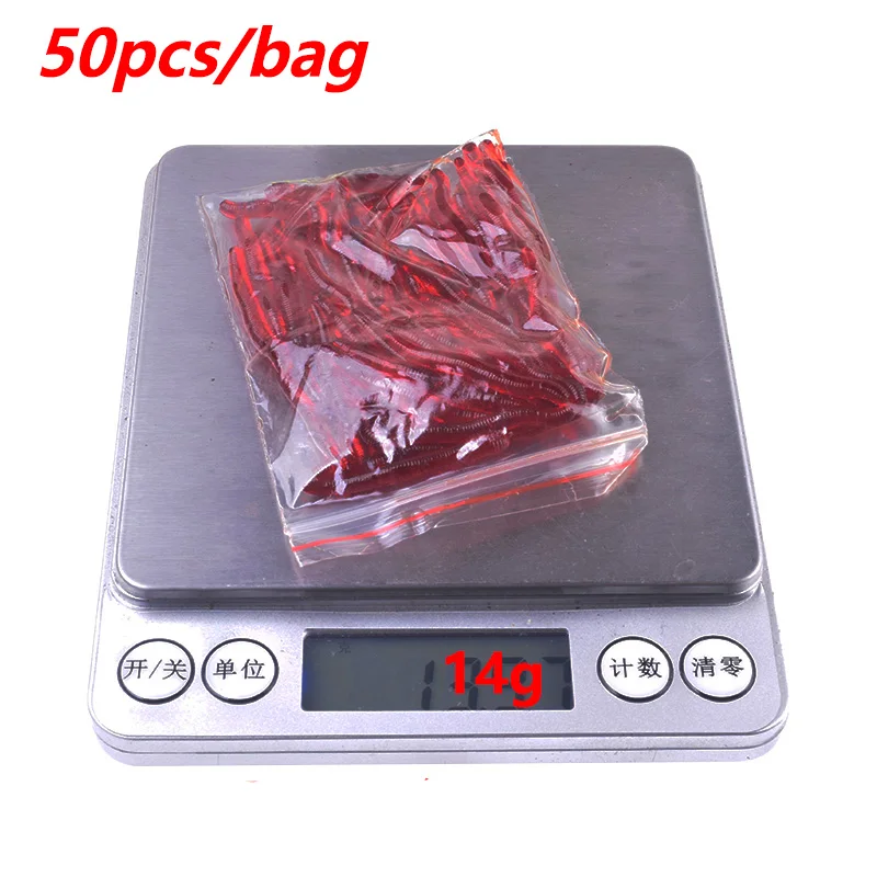 50 o 100 Uds olor a camarón gusano rojo señuelo suave 3,5 cm realista gusano de tierra aditivo de sal cebo Artificial de goma para aparejos de pesca de carpa lubina