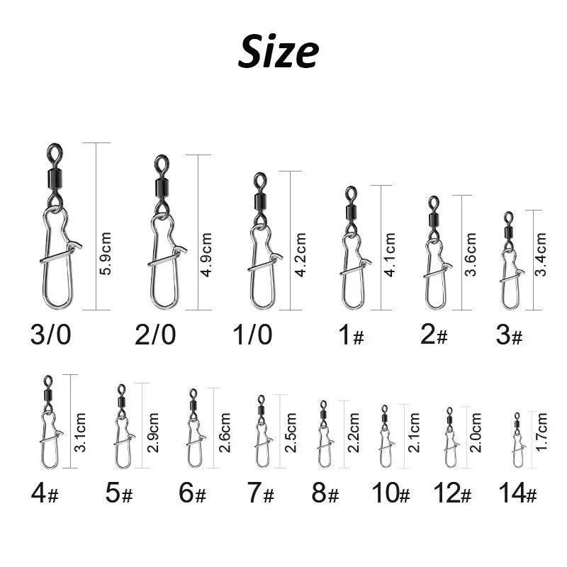 • Múltiples tamaños: con tamaños de #2 、 #4 、 #6 、 #8 、 #10 、 #12, estos pasadores de conector de pesca pueden acomodar una variedad de tamaños de línea de pesca.