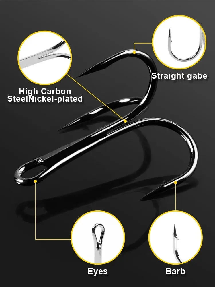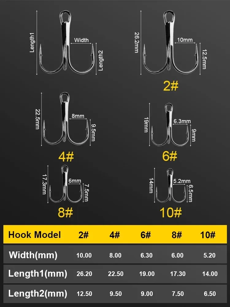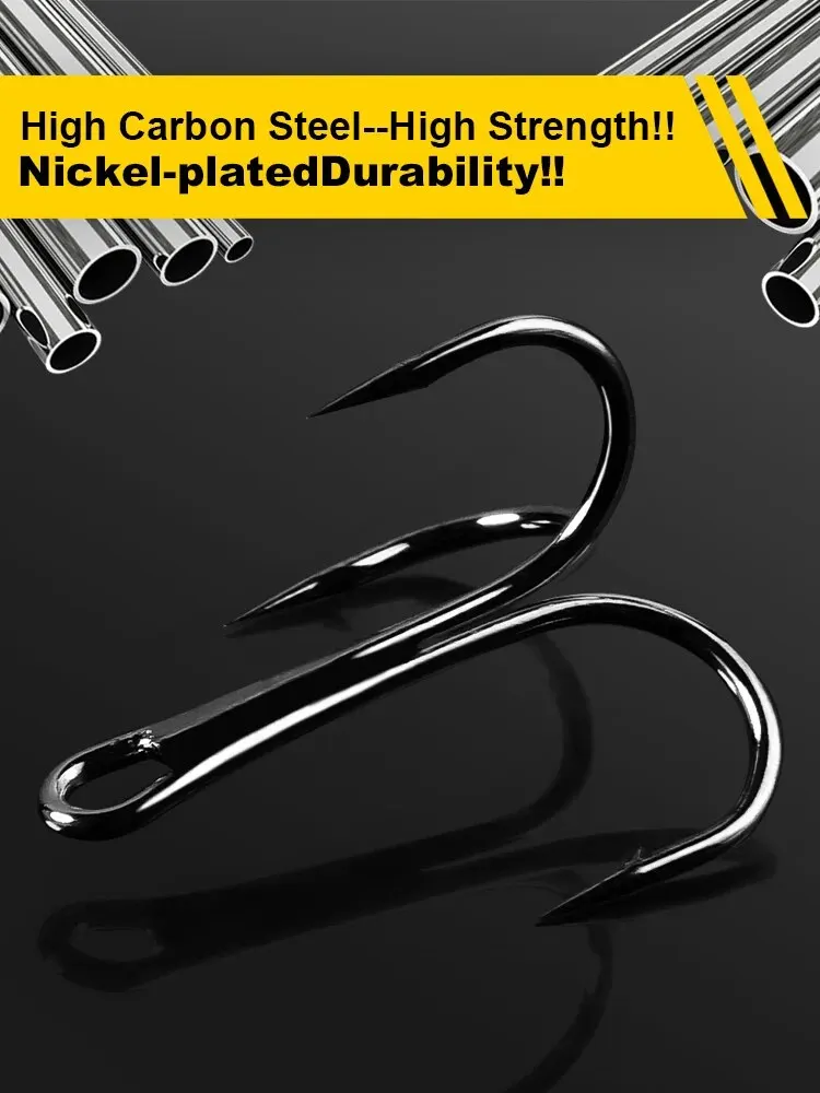 • Blanco harde lokken: de ronde gebogen drievoudige haken zijn perfect voor het bevestigen aan blanco harde kunstaas, waardoor ze aantrekkelijker zijn om te vissen.