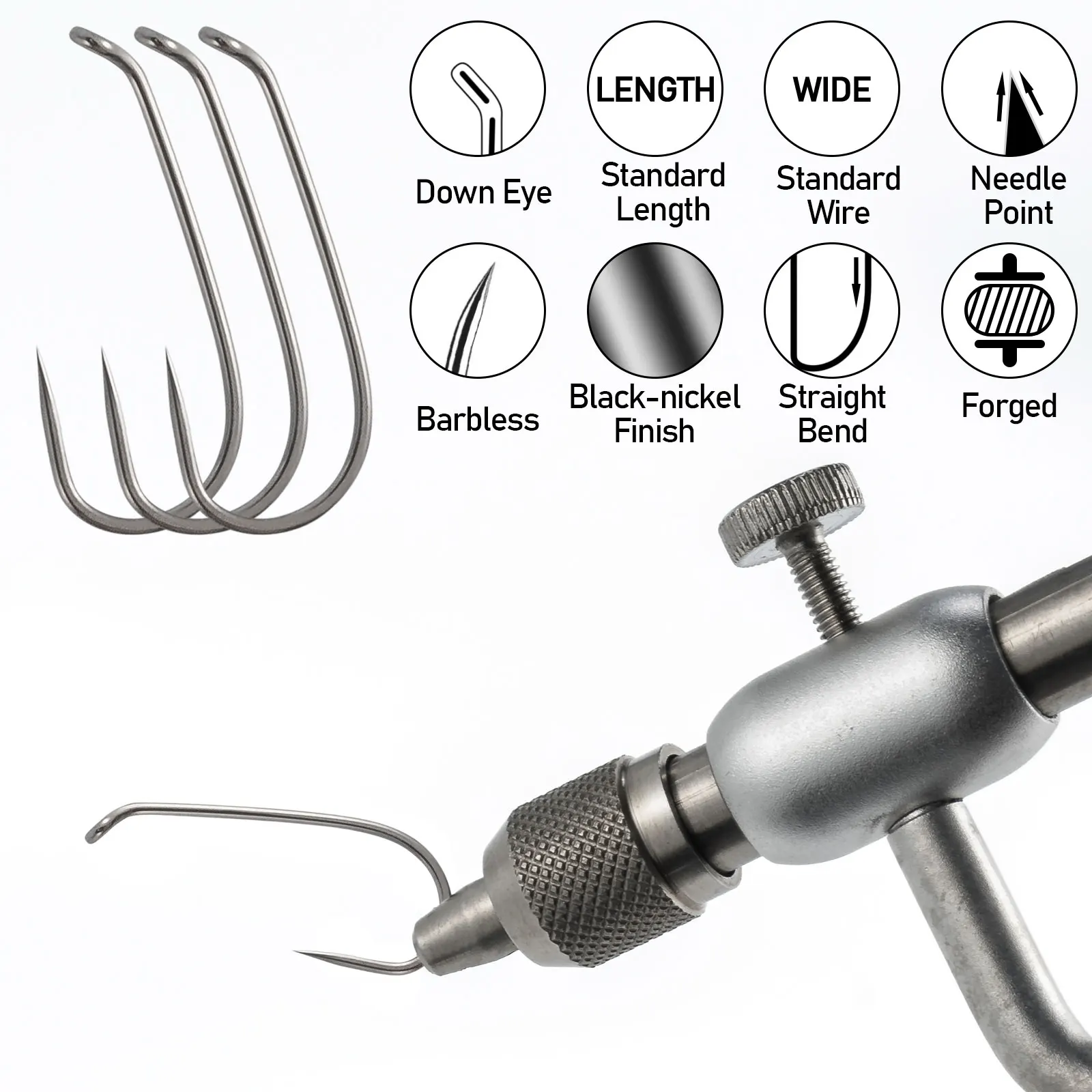 Diseño: El gancho para moscas húmedas y secas presenta un ojo forjado, ojo abajo, alambre de tamaño estándar, vástago largo y punta químicamente afilada.