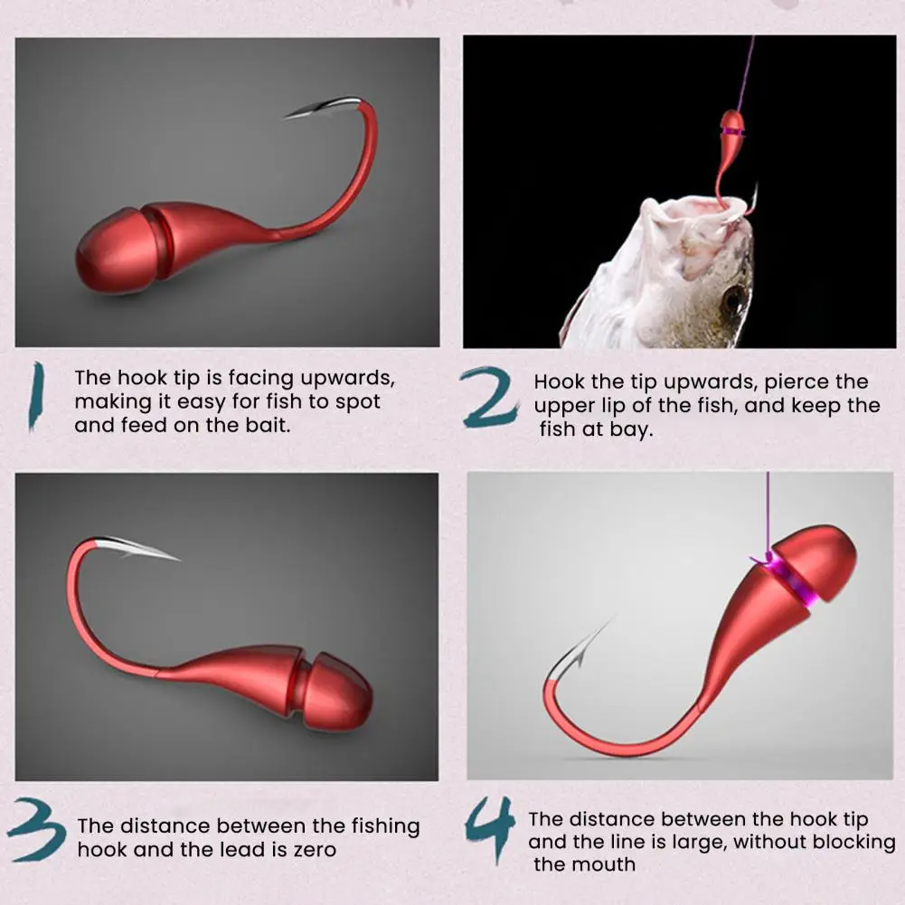 Punta afilada de precisión para un enganche mejorado: Equipado con una punta ultraafilada, el anzuelo penetra las bocas de los peces al instante al contacto.Este diseño de precisión aumenta significativamente su tasa de captura al minimizar los golpes perdidos, haciendo que su experiencia de pesca sea más eficiente y gratificante.