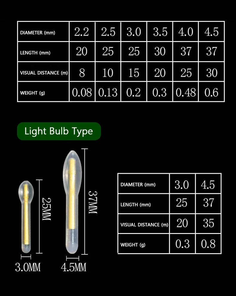 • Flotador luminoso:Este flotador de pesca está diseñado con propiedades luminosas, mejorando la visibilidad en aguas oscuras, por lo que es una herramienta esencial para la pesca nocturna.