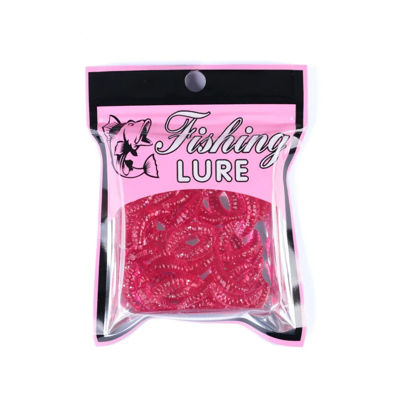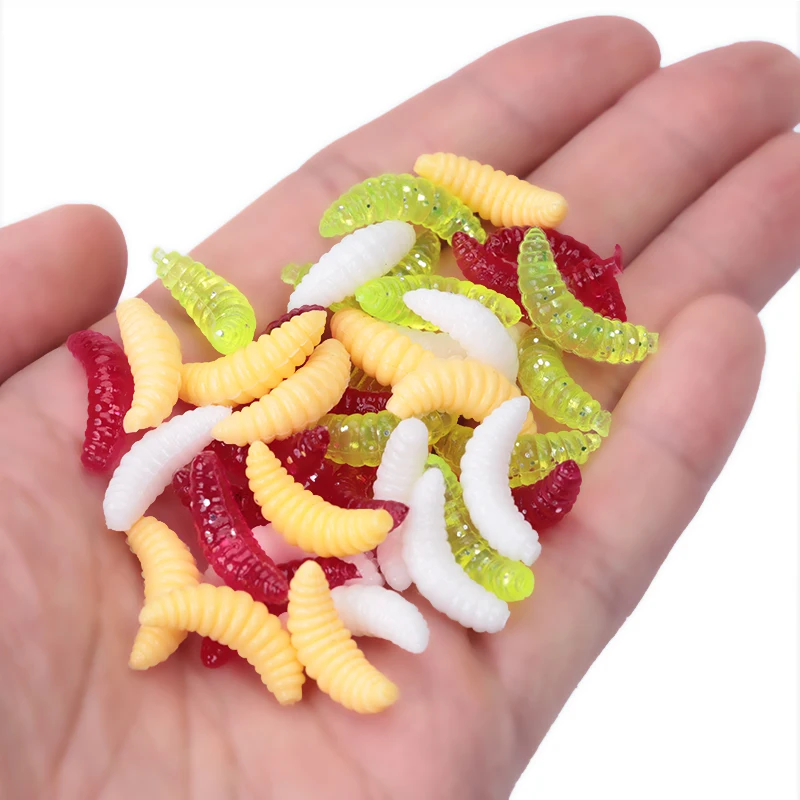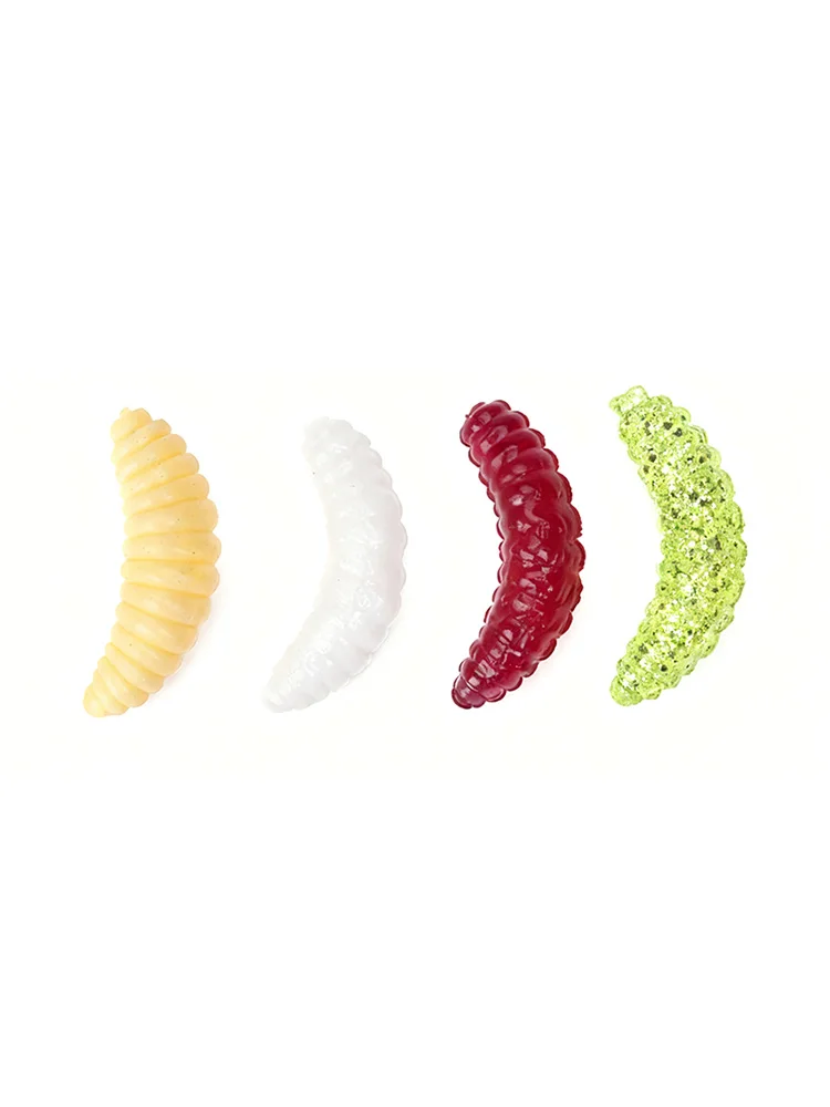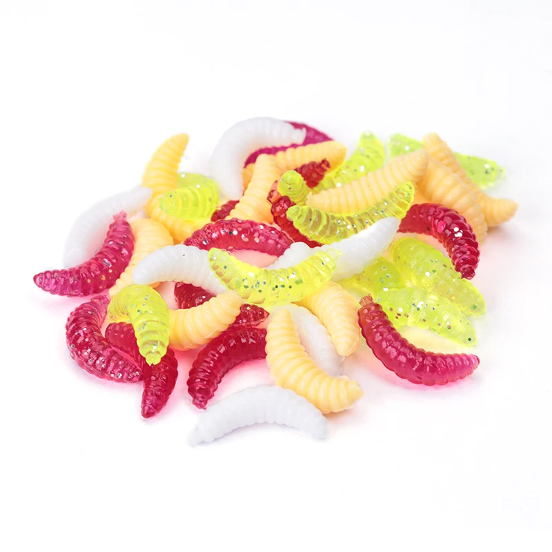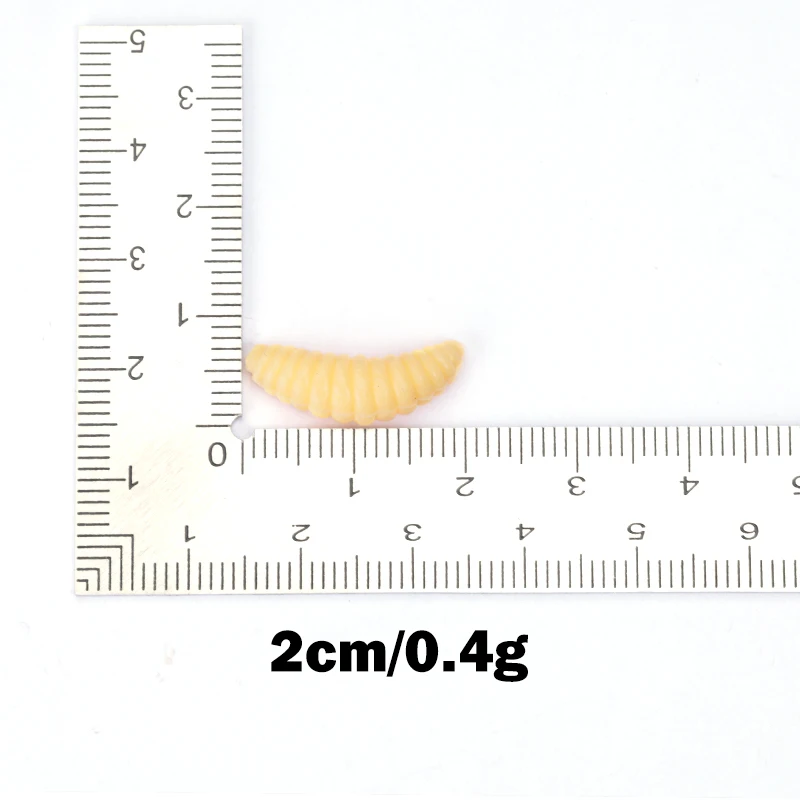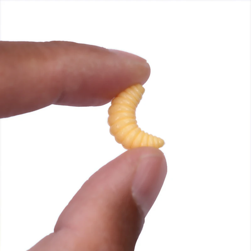 Descripción :50 Uds cebo de silicona maggot Grub señuelo de pesca suave 2cm 0,4g engranaje de gusanos de pan Artificial para accesorios luminosos de invierno