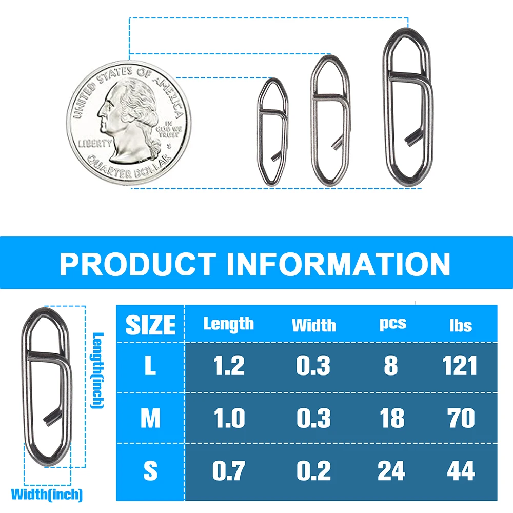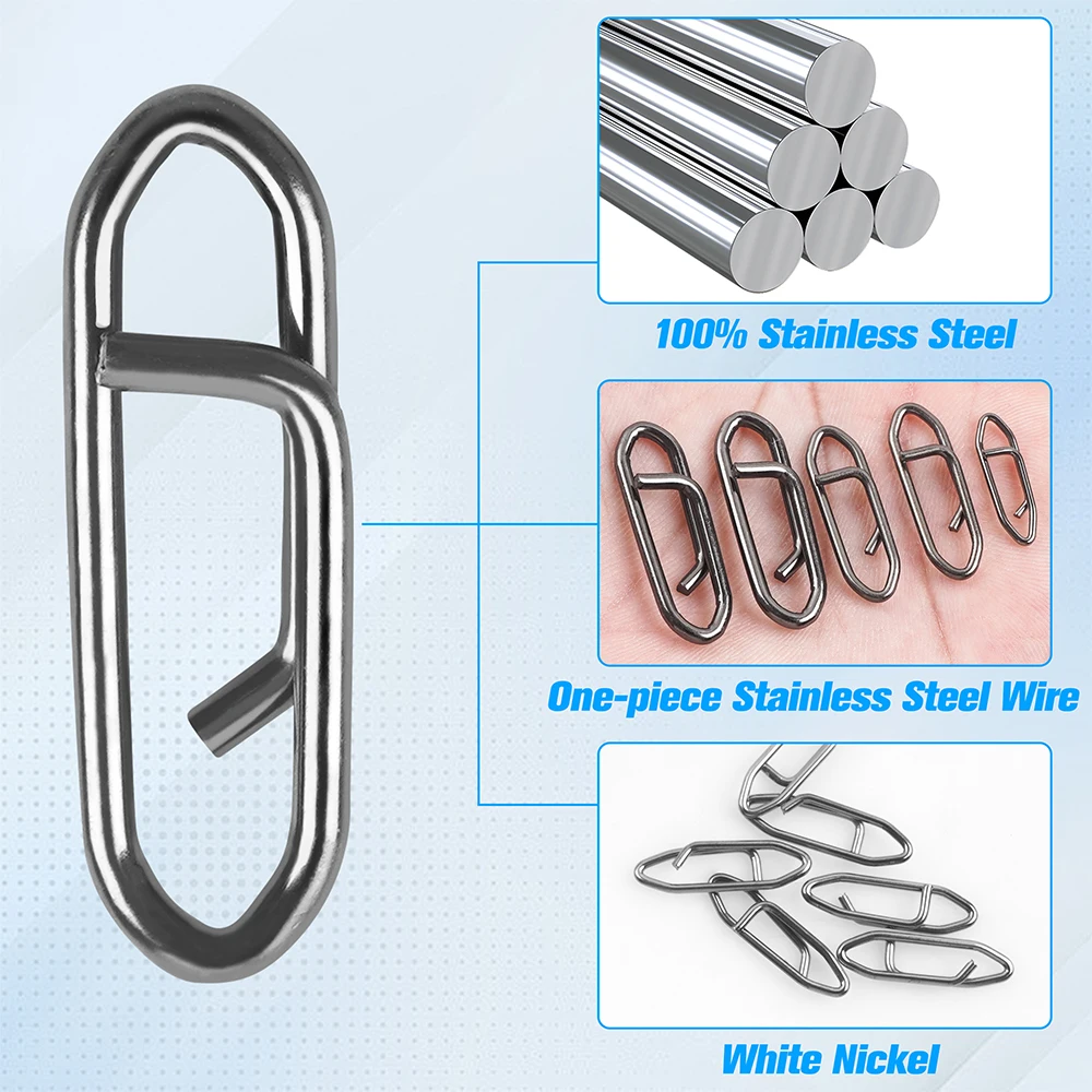 MATERIAL DE ACERO INOXIDABLE: Los clips de pesca están hechos de acero inoxidable, alta dureza, alta resistencia al desgaste y alta estabilidad, durante mucho tiempo se pueden usar en agua salada, una mejor opción para la pesca en agua salada.