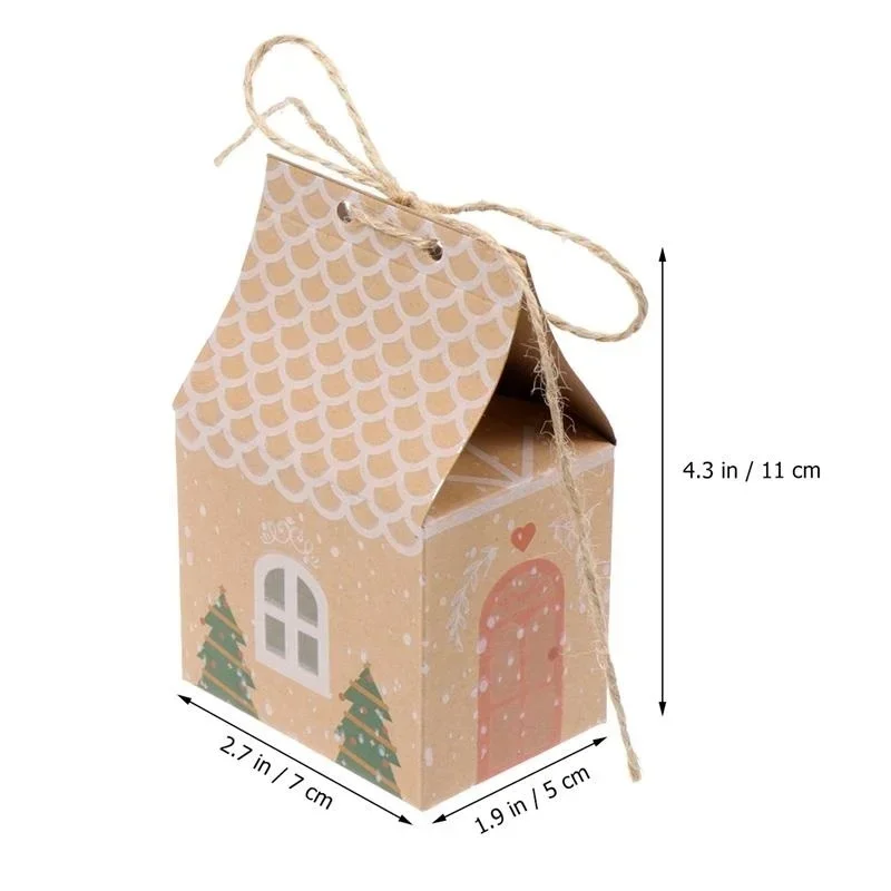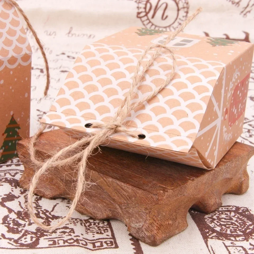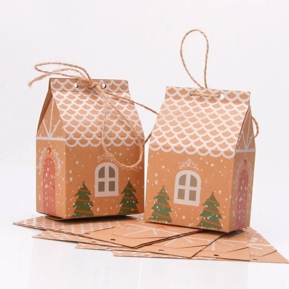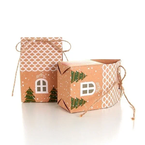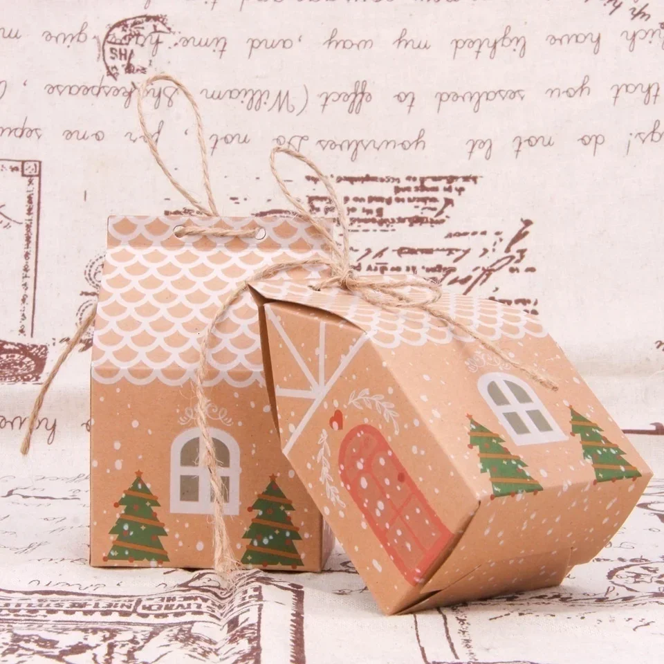 50 Uds. De decoración navideña para fiesta, bolsa para galletas con forma de casa, caja de dulces de Navidad, bolsas de regalo de papel Kraft, caja de dulces