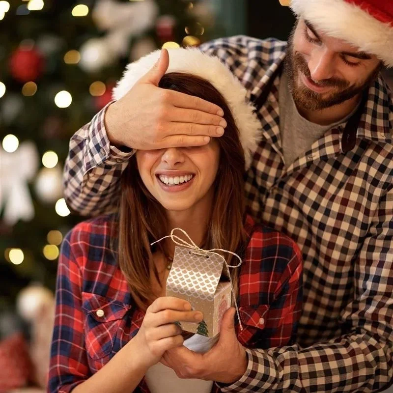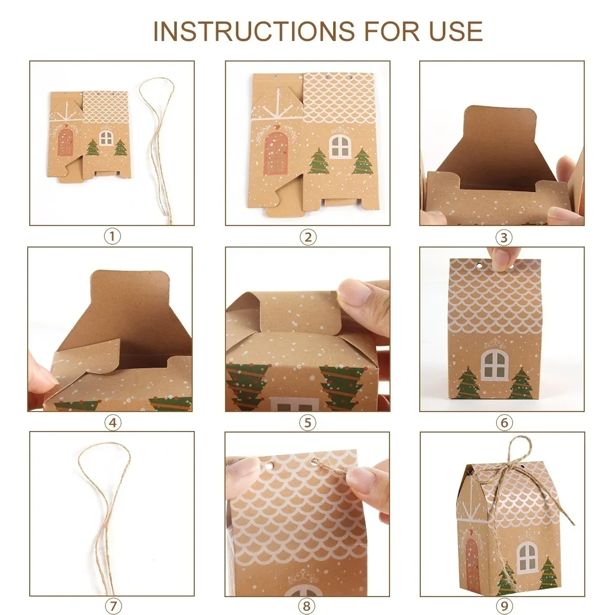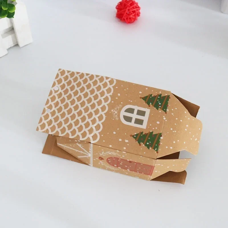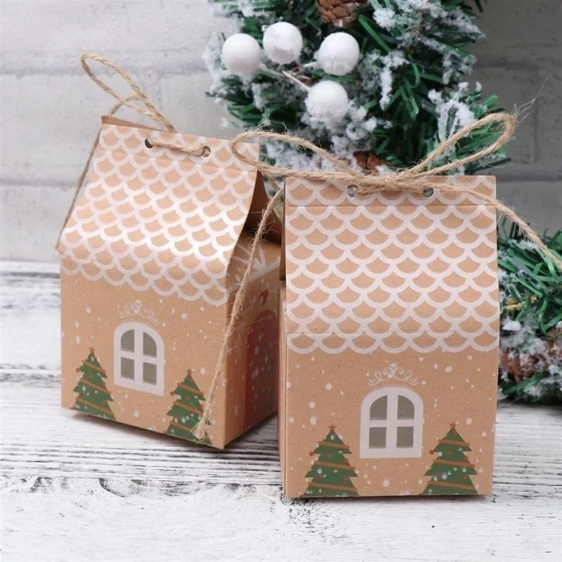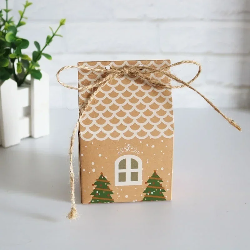50 Uds. De decoración navideña para fiesta, bolsa para galletas con forma de casa, caja de dulces de Navidad, bolsas de regalo de papel Kraft, caja de dulces