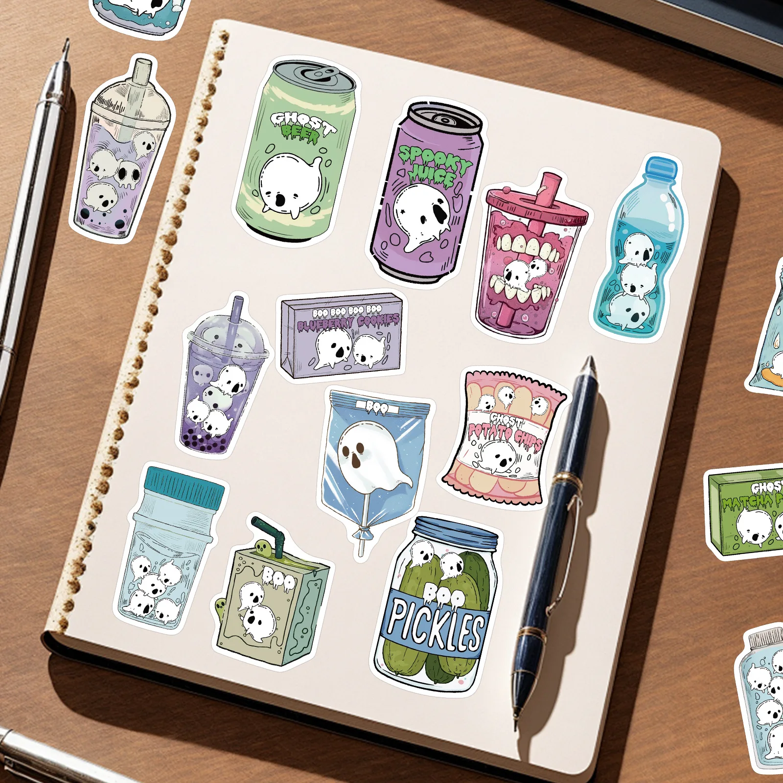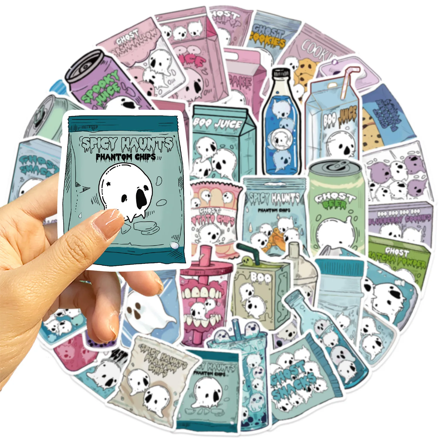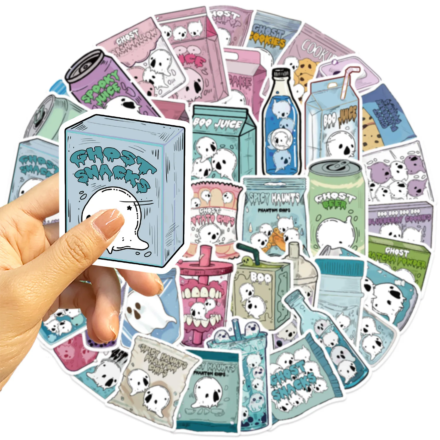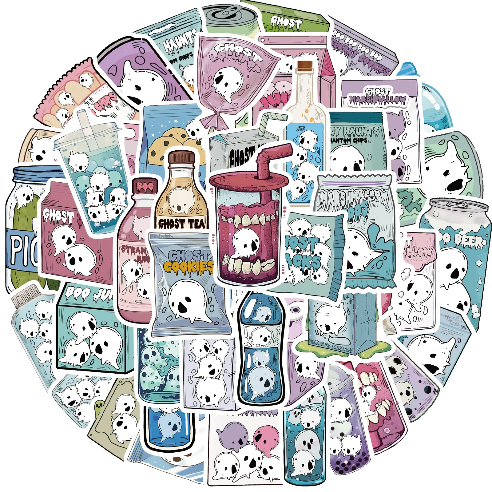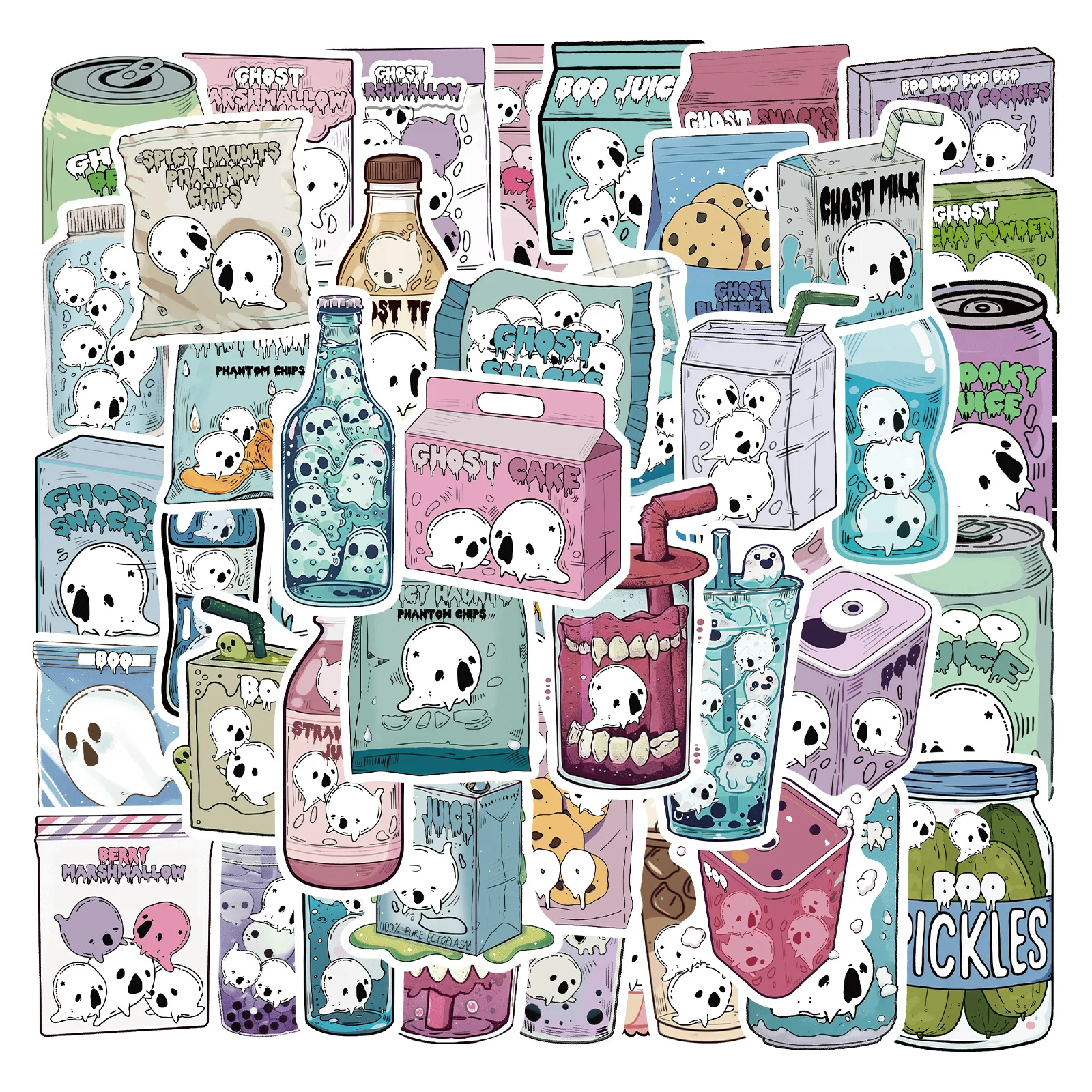 50 Uds Halloween lindo fantasma alimentos bebidas pegatinas de grafiti teléfono guitarra portátil maleta taza pegatina impermeable juguetes para niños