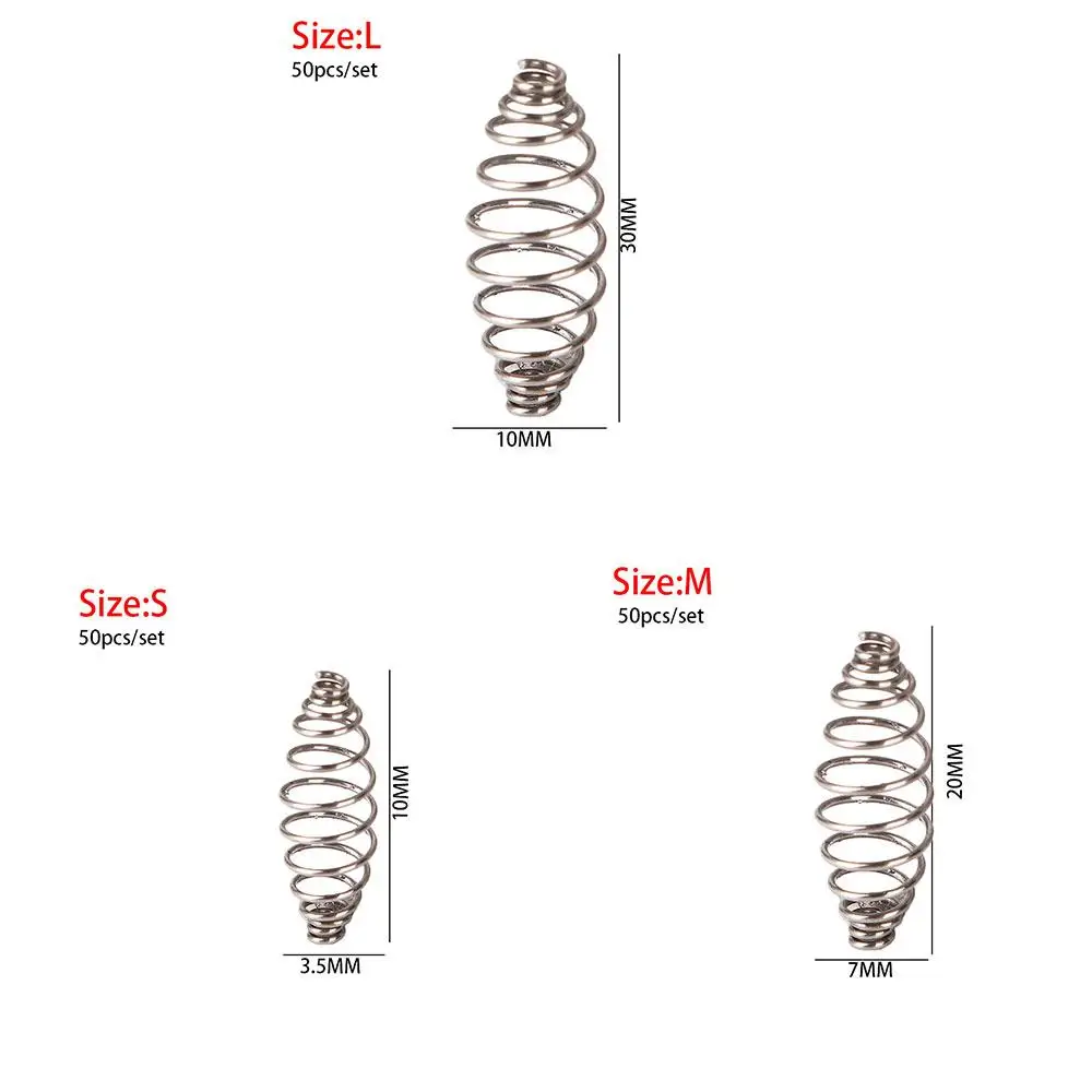 Material: Stainless Steel Size: S 10mm length; M 20mm length; L 30mm length. Color:Show as Pictures Application : For Carp Rig Making Package Included: 50pcs *Fishing Spring Feeder Cage. Note:Size manual measurement, please allow small deviation.