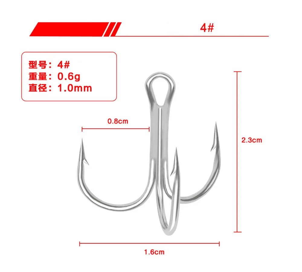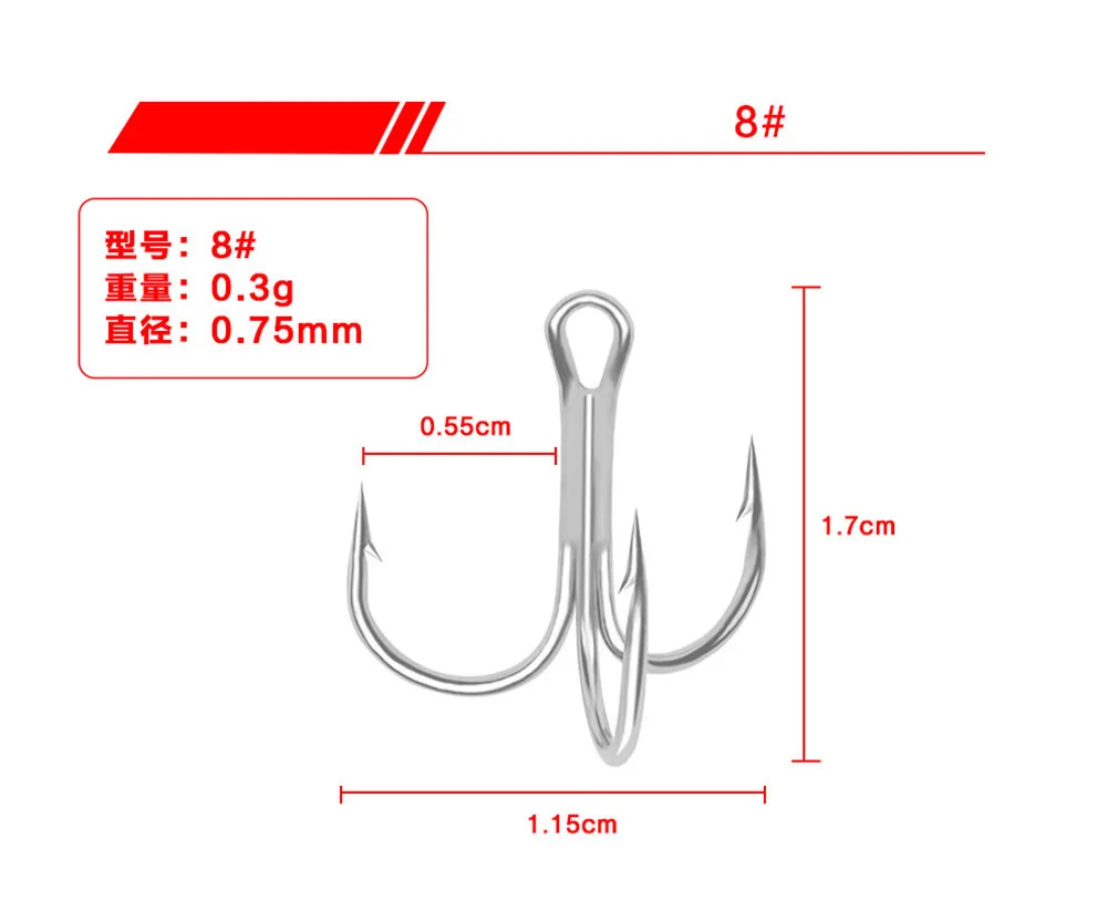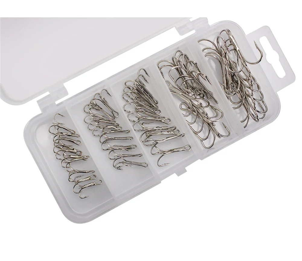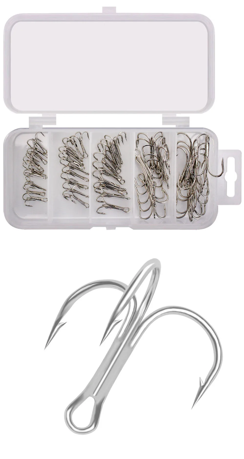 50 unidades/caja 2 # 4 # 6 # 8 # 10 # Anzuelo de pesca negro, anzuelos triples de acero rico en carbono, aparejos de pesca, triples curvados redondos para lubina