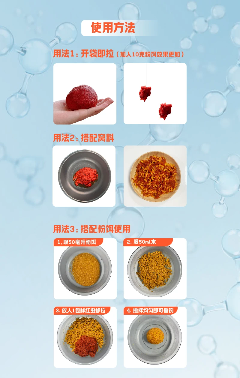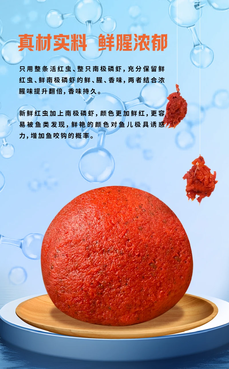 1.Ingredientes naturales: Con extractos de krill y gusanos rojos, los ingredientes naturales se fusionan para imitar la fuente alimentaria natural y atraer a los peces.
