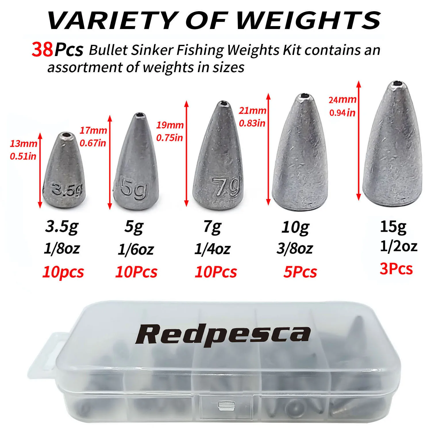 AMPLIA VARIEDAD DE PESOS: es ideal para una variedad de pesos para cualquier tipo de pesca. Una bonita caja contenedora los mantiene separados y a mano. Buena gama de tamaños para conseguir su plataforma perfecta. Un imprescindible en la pesca de lubina para hacer aparejos de Texas, aparejos de Carolina y otros aparejos con señuelos blandos.