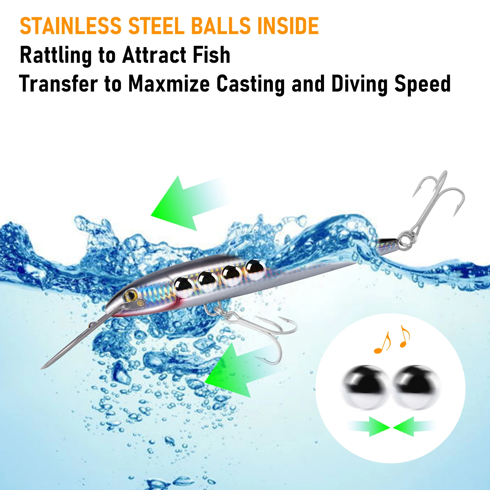 【Diseño de modelo de traqueteo】Hay algunas bolas de acero en el interior, lo que hace que se transfiera para maximizar la velocidad de lanzamiento y buceo largas y generar algunos sonidos para atraer peces.¡Mejora tu experiencia de pesca!