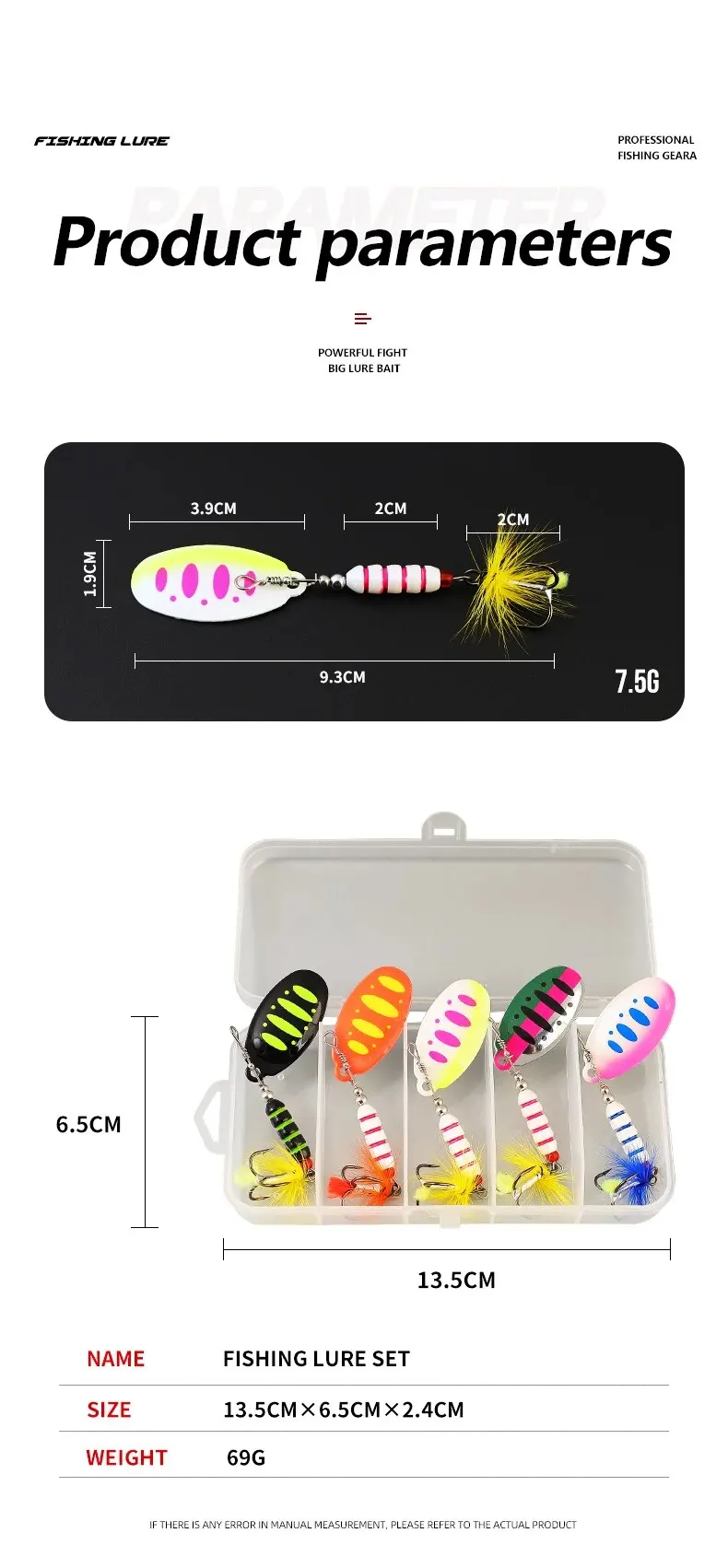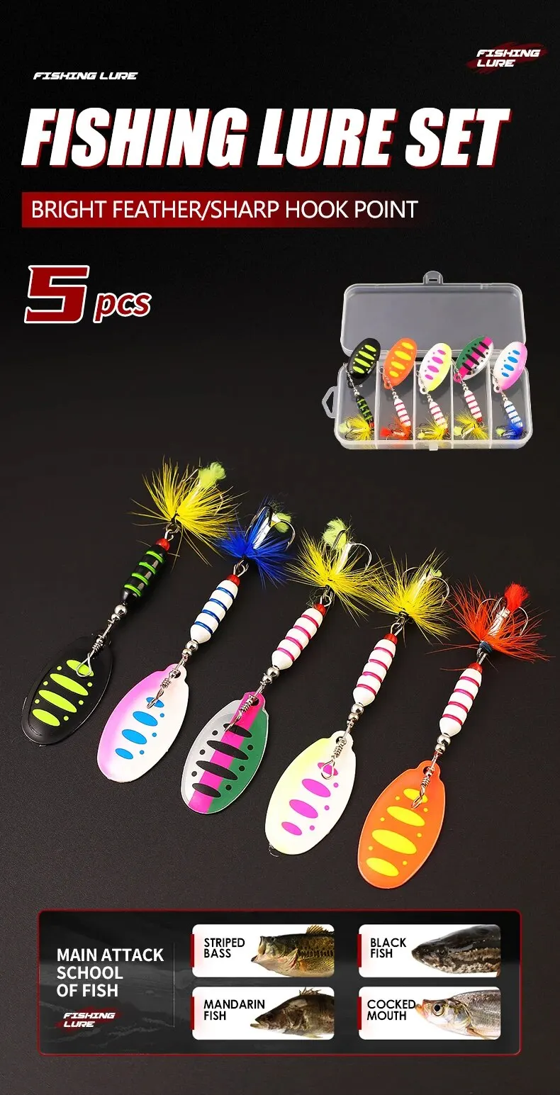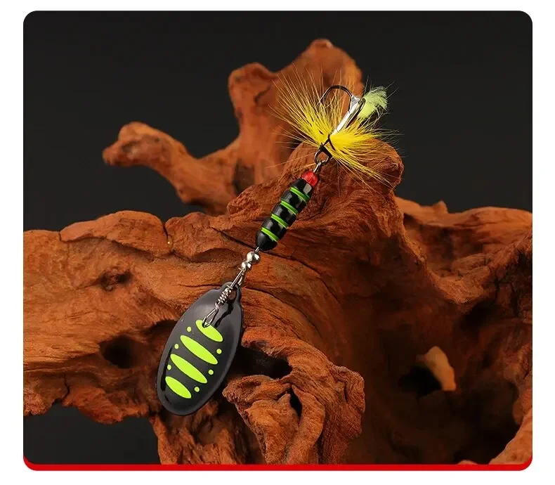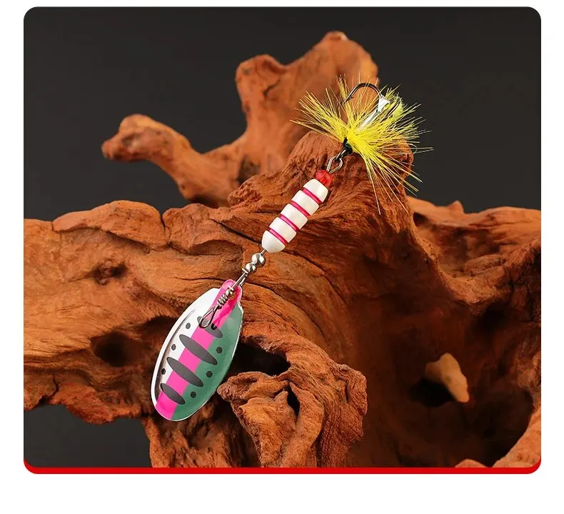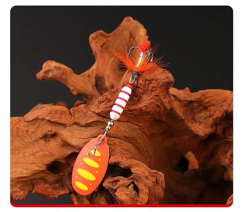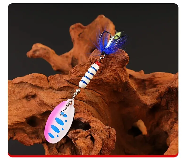 【Kenmerken】: Dit product bestaat uit kleurrijke roterende glitter, koperen hanger, drie verenhaken, flexibel zwemmen in het water, geschikt voor meerdere soorten vissen.
