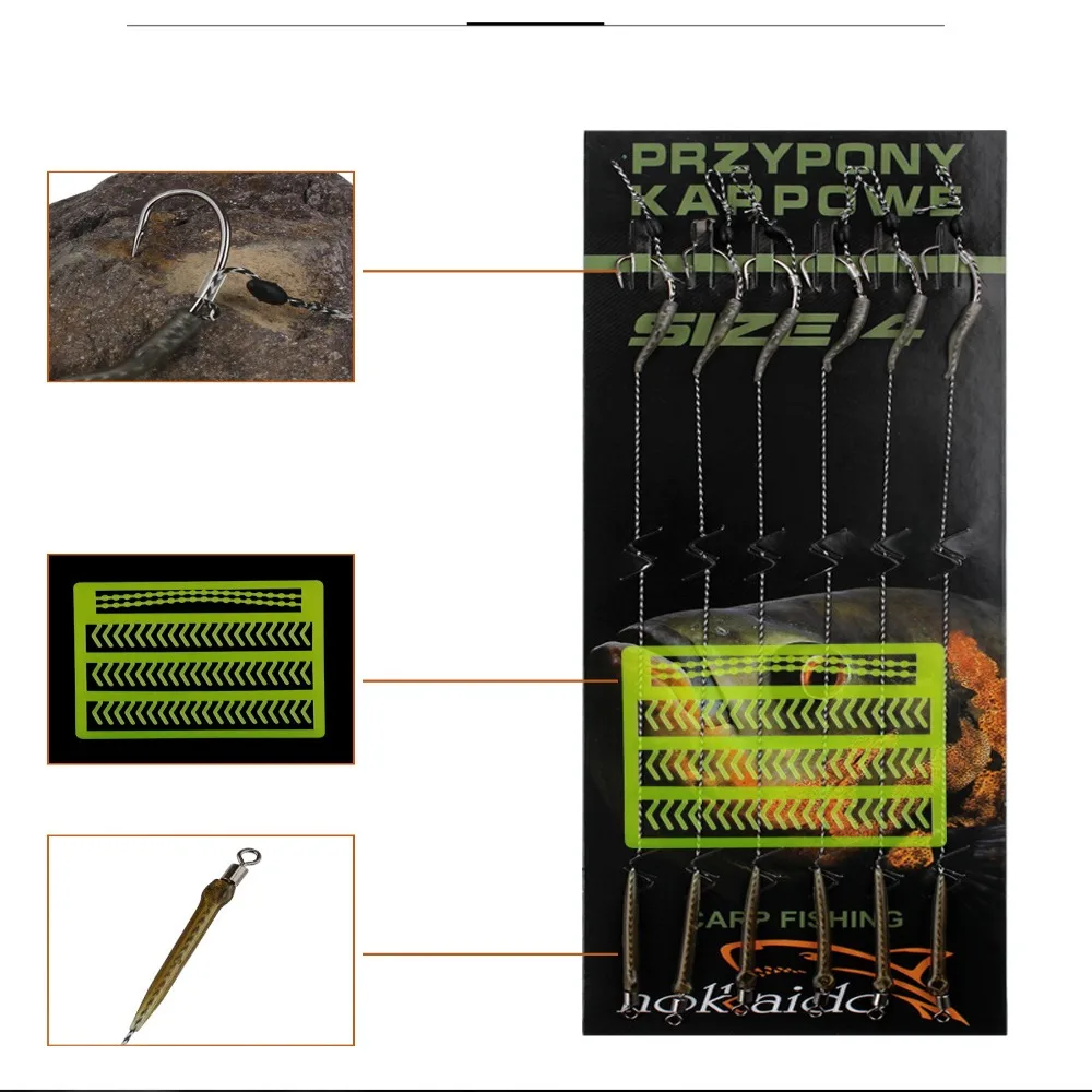 1. Ready Made Carp Fishing Hooks: This set includes 6-8 ready-made carp fishing hooks, providing convenience and efficiency for anglers. The hooks are pre-tied and ready to use, saving time and effort in preparing fishing rigs.