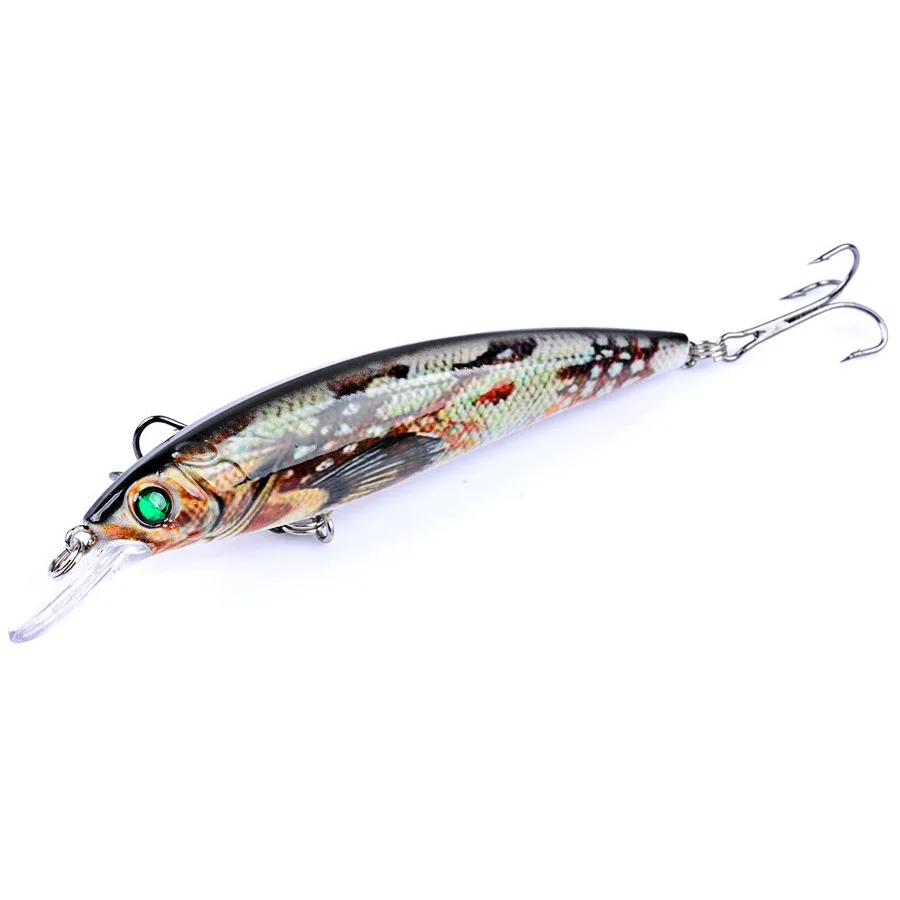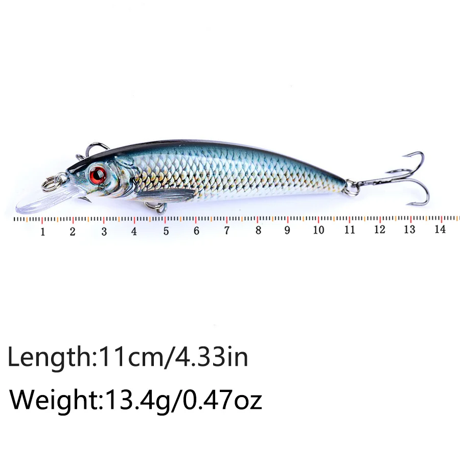 Característica: Tipo: cebo de pesca minnow Peso: 13,4 g Longitud: 11 cm Ganchos:4# gancho Profundidad de natación: 0,6 m -1,8 m Anzuelos de calidad: 2x anzuelos triples fuertes Anillo: Anillo plano fuerte Peixe objetivo: chub pálido, lubina, picos, carpa de cheque amarilla, perca china, culter de boca superior