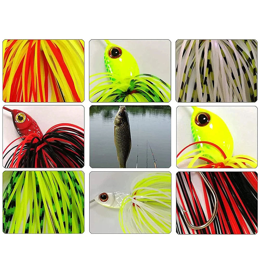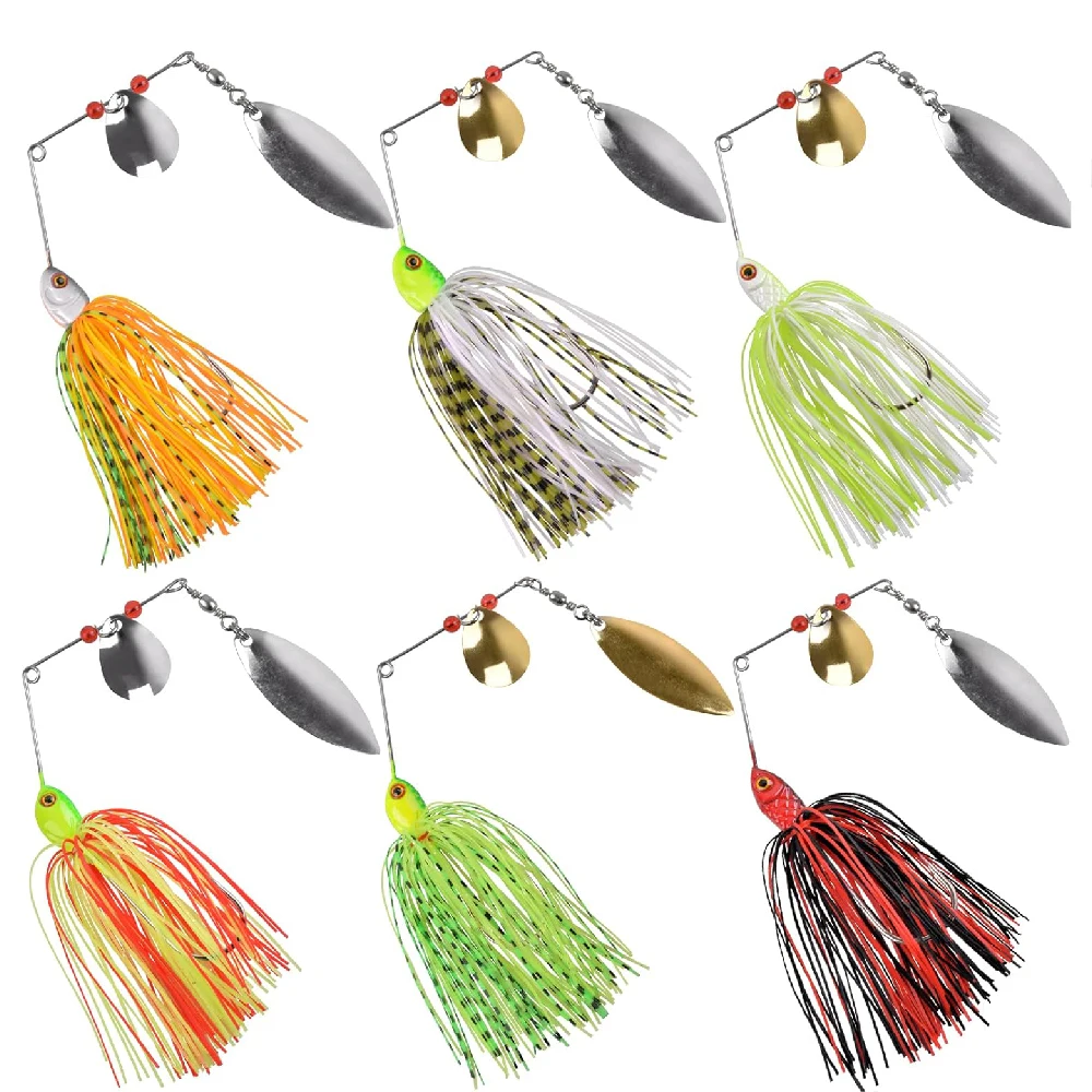 1.Kit Spinnerbait, incluye 6 spinnerbaits de colores populares que funcionarán durante toda la temporada para lubina, lucios, leucomas y más.Por peso alrededor de 0,56 oz; tamaño de gancho 3/0; falda de silicona elástica de colores.