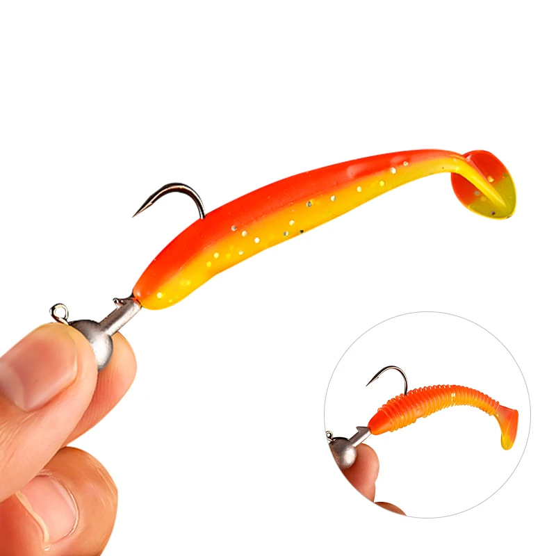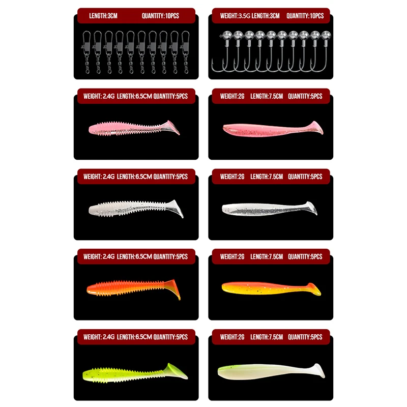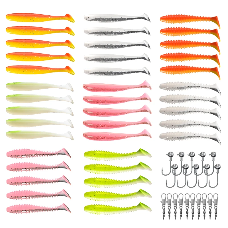 61 unids/set Kit de señuelo suave señuelo de pesca suave 6cm/7,5 cm 1,3g/2g anzuelo con cabeza de anzuelo 3cm 3,5g anzuelos de pesca con caja de aparejos de pesca giratoria