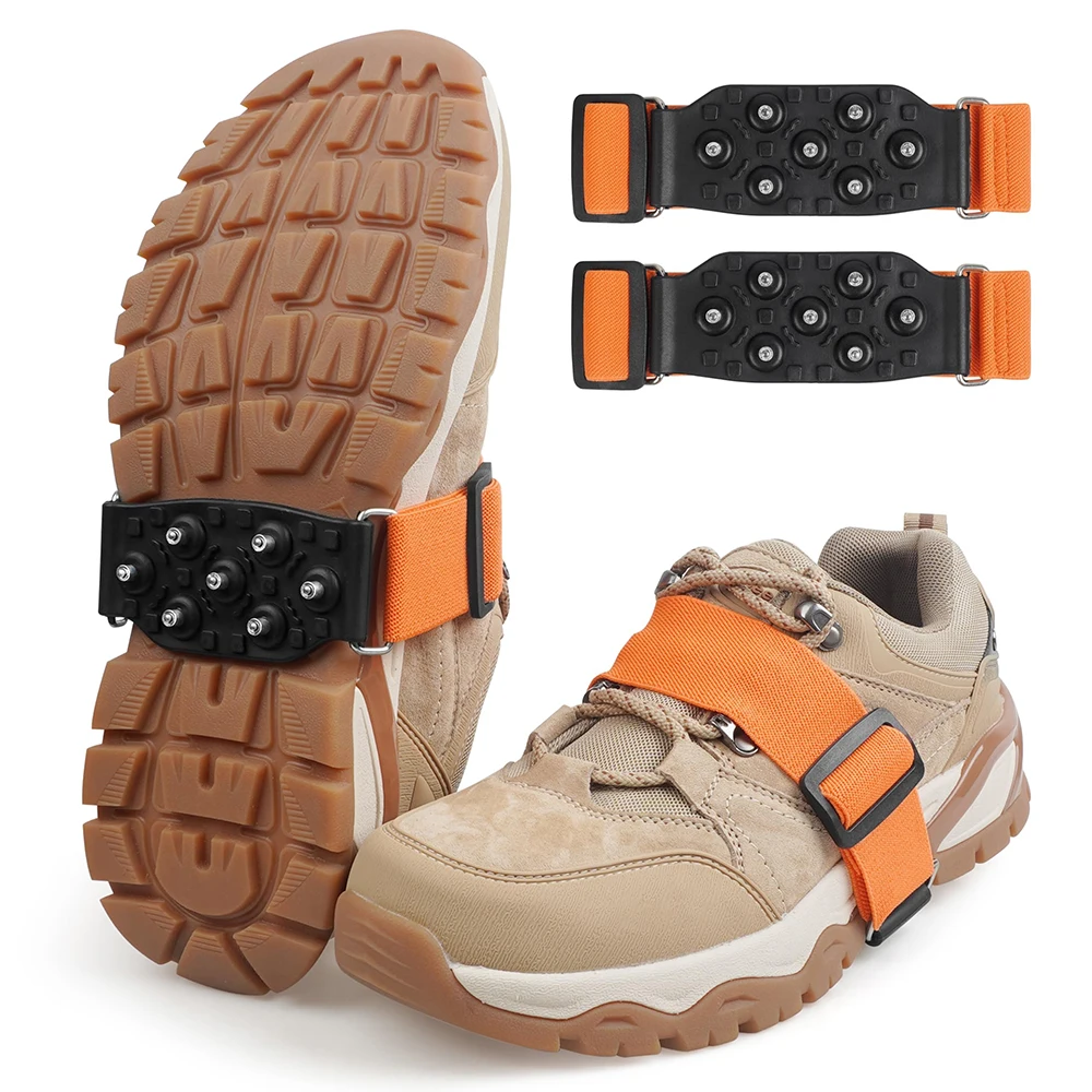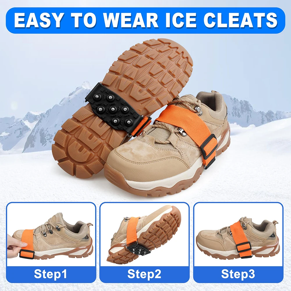 【TAMAÑO ÚNICO PARA TODOS】 Los tacos de hielo con crampones están diseñados con una correa elástica ajustable para adaptarse a diferentes tipos y tamaños de calzado, zapatos, zapatillas o botas, y tener confianza en su ajuste seguro.