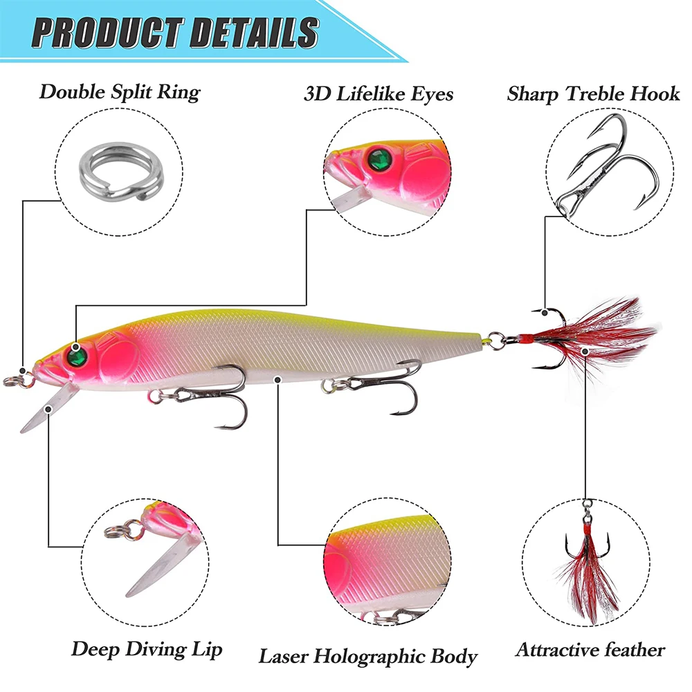 1. Simulated body - 3D Life like eyes with Fish-attracting laser printed body provides excellent appearance of fishing lures.