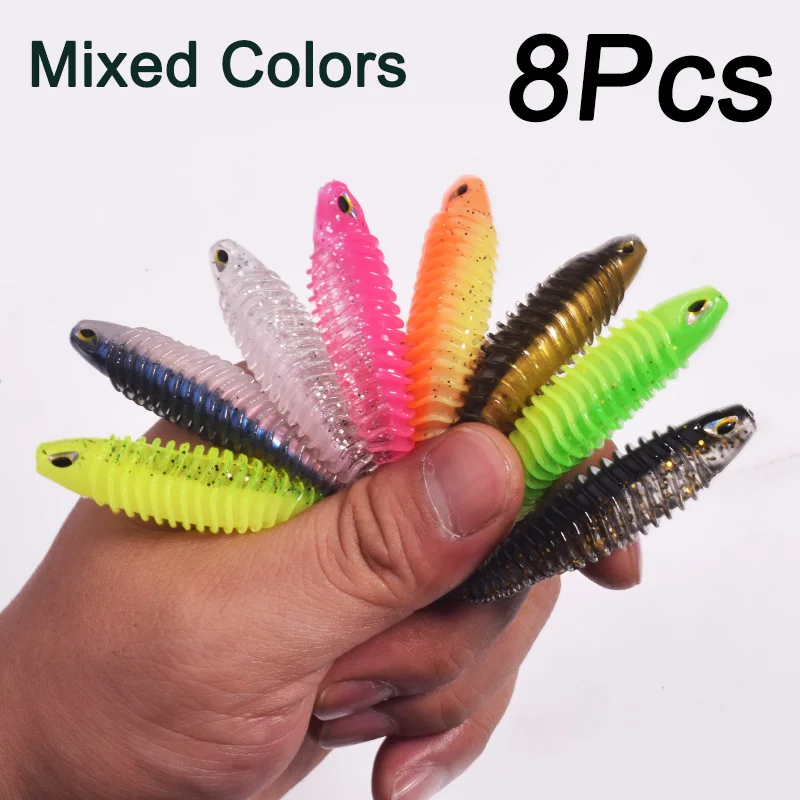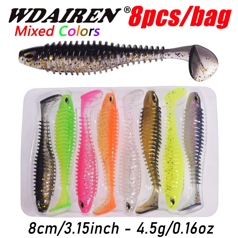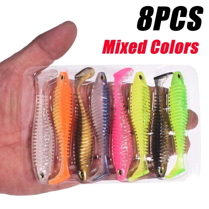 8 unids/bolsa ojos 3D cola de pez cebo suave 8 cm/3,15 pulgadas 4,5 g plantillas Wobblers señuelos colores mezclados silicona Artificial PVC cebo de goma lubina Swimbait aparejos de pesca