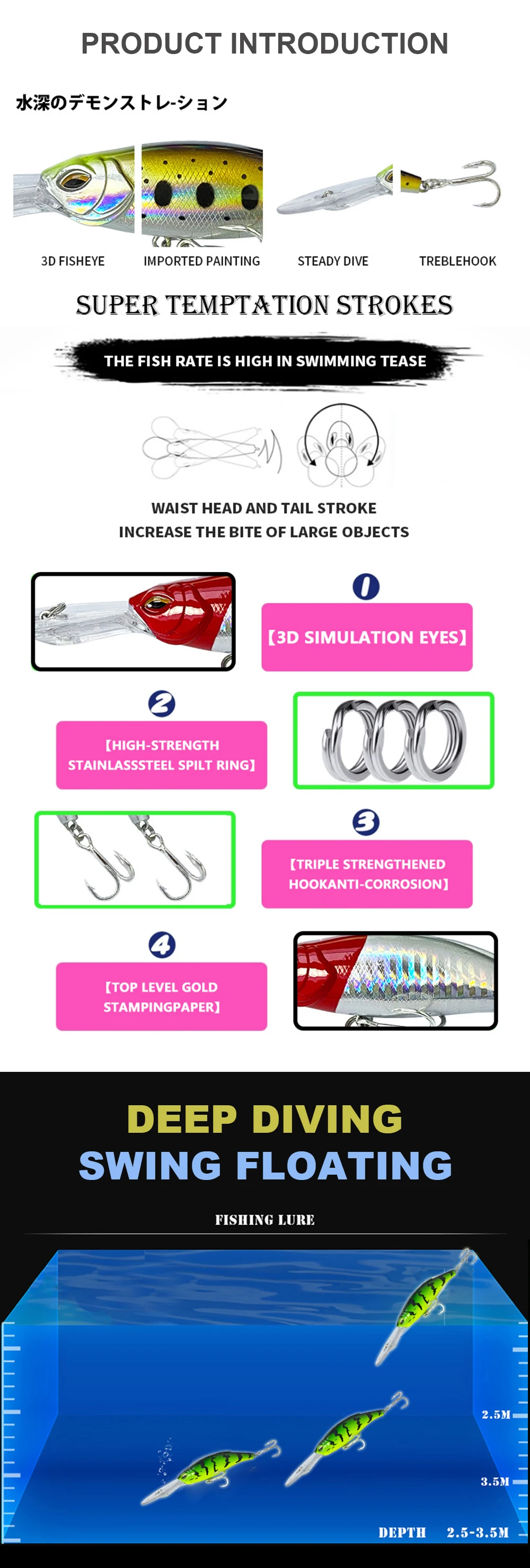 3. Los cebos tienen una pintura realista y ojos 3D vívidos, hacen que el cebo parezca peces reales nadando en el agua durante la pesca.