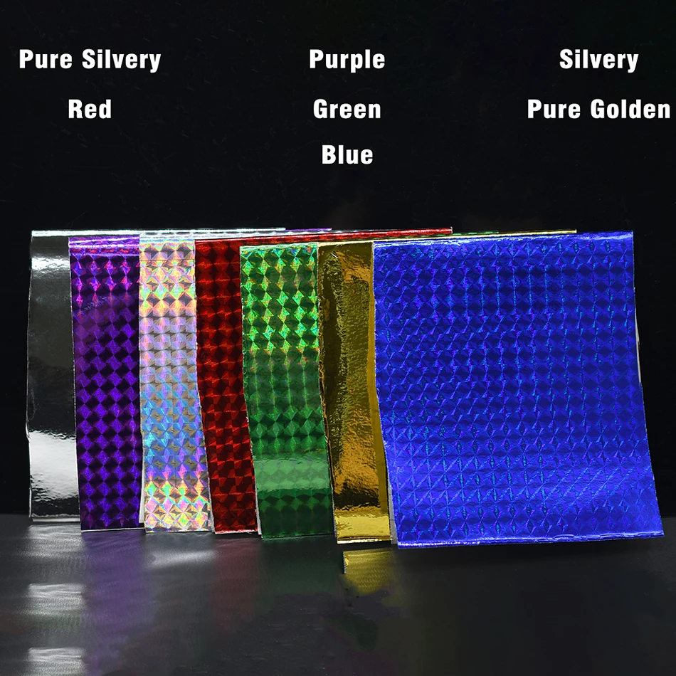 Product descriptionHolographic film tape for lure making, fly tying,Metal Hard Baits Change Color StickerSize: about 10cm X 20cm / sheetColors: Silver / Green / Golden / Purple / Red / Blue / Pure Golden / Pure SilverTips: the film with adhesive, to secure it on lures for flies, please use with glue add or varnish.Components IncludedPacking unit:8 Sheets/lot (Mixed 8 Sheets , 8 colors Each 1 Sheets)