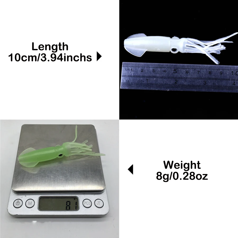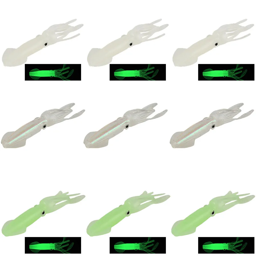 Señuelos de calamar de 0,28oz, 9 Uds., 3,94 pulgadas, para pesca de lubina, agua salada, cebo de calamar de agua dulce que brilla en la oscuridad, señuelos de calamar suaves para salmón