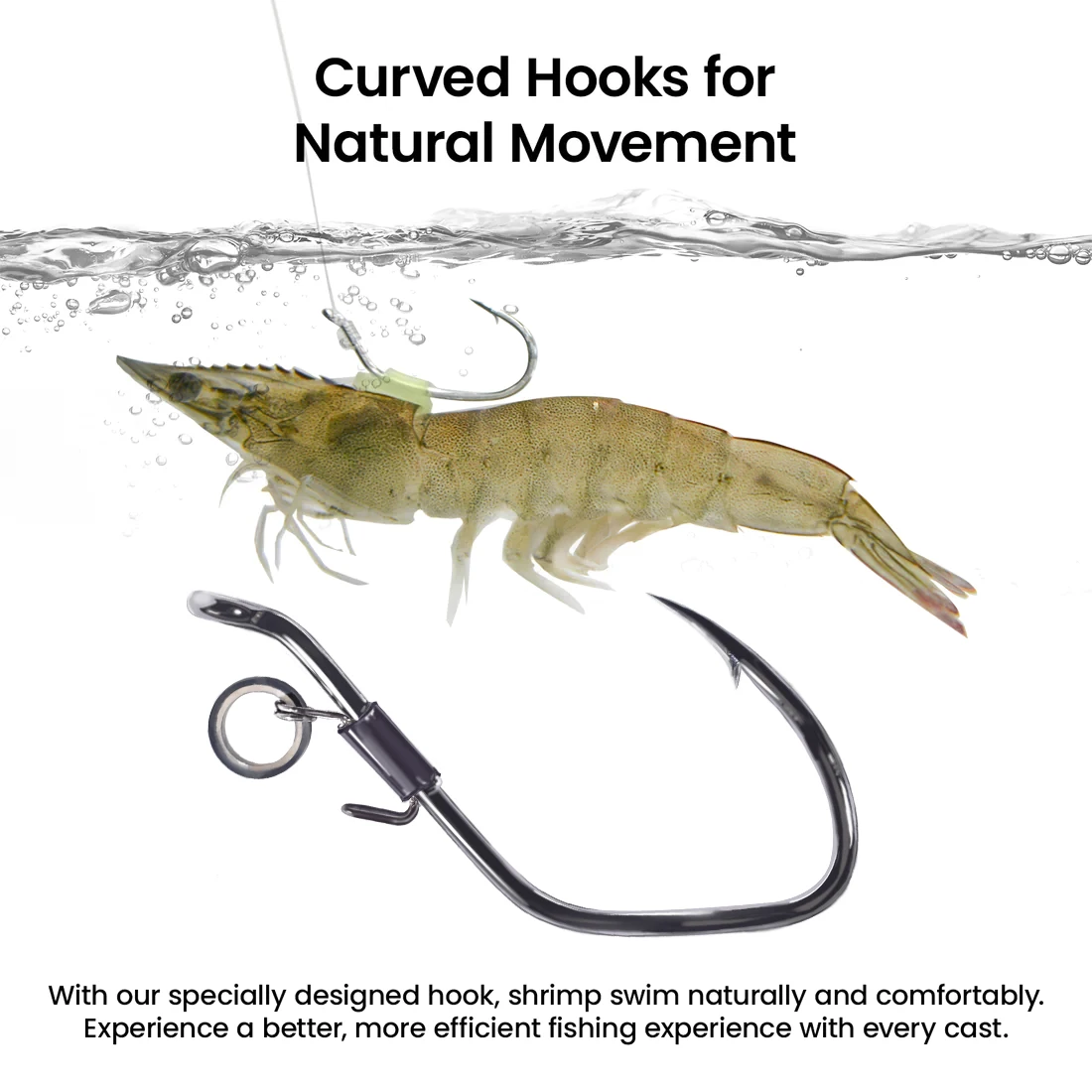 El anzuelo está inteligentemente diseñado para sujetarse de forma segura a las cáscaras de los camarones sin perforarlos ni dañarlos, lo que garantiza que permanezcan con la máxima vitalidad en el agua por más tiempo, haciéndolos más atractivos para los peces más grandes.
