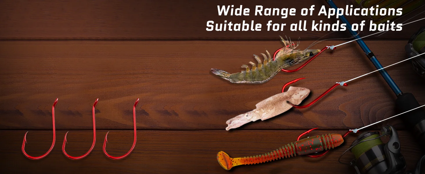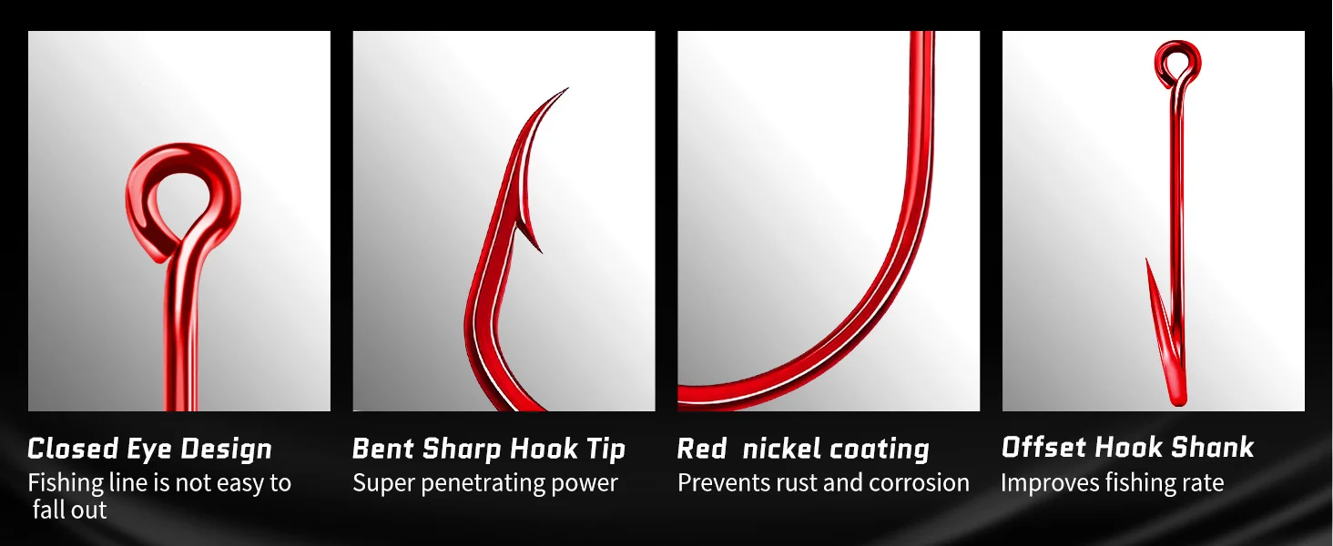 Los anzuelos de pesca son realmente afilados con un diseño de púas especial, para una menor tasa de mortalidad. Punta de desplazamiento, punta de anzuelo afilada y púa más fáciles de perforar la boca del pez, reducen la tasa de escape y la tasa de muerte de los peces.