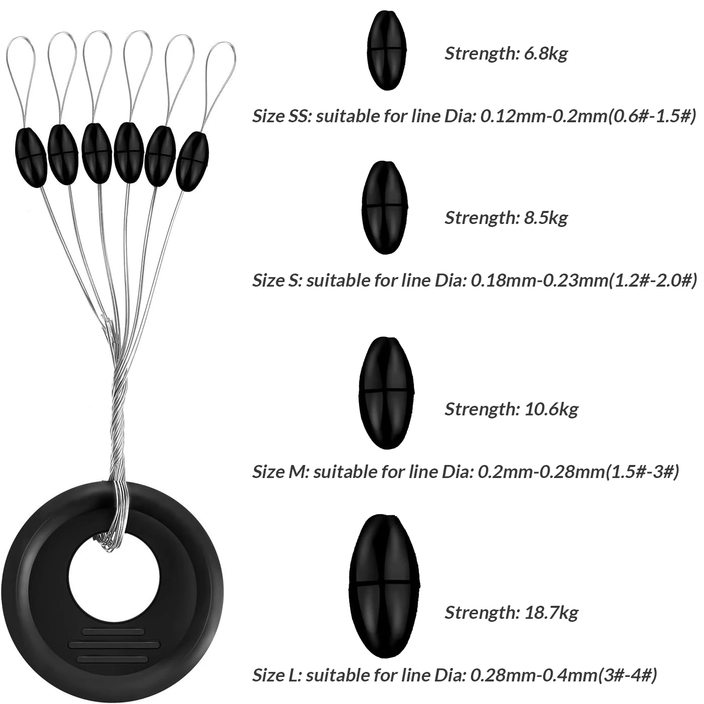 Hecho de alambre de acero, plástico y caucho, el tapón de pesca está hecho de material de goma suave, no daña el hilo de pescar, no se aflojará durante mucho tiempo para evitar la exposición y el envejecimiento.