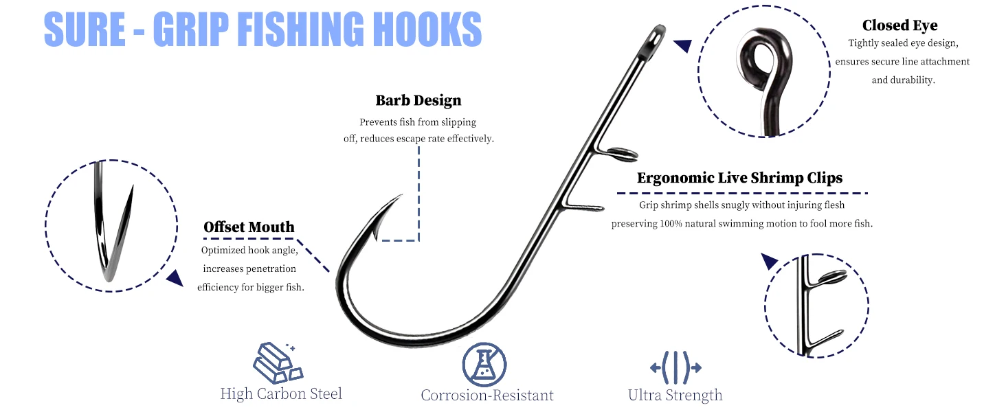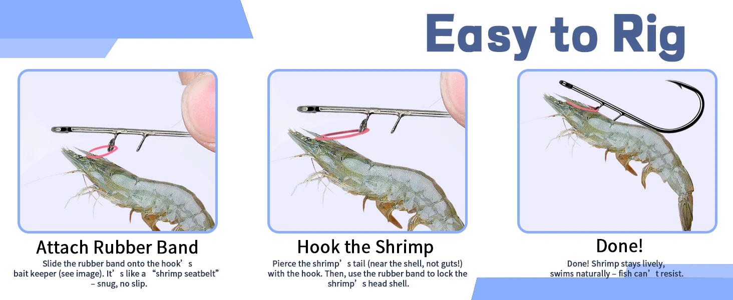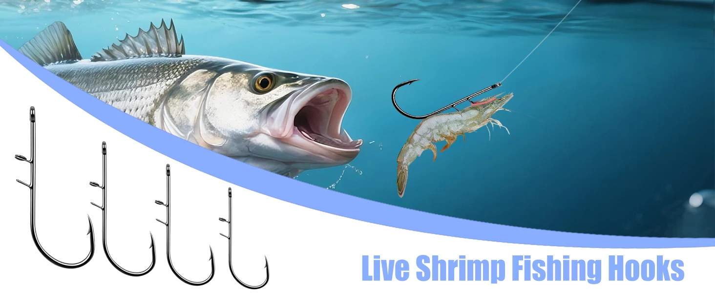 El anzuelo está inteligentemente diseñado para sujetarse de forma segura a las cáscaras de los camarones sin perforarlos ni dañarlos, lo que garantiza que permanezcan con la máxima vitalidad en el agua por más tiempo, haciéndolos más atractivos para los peces más grandes.