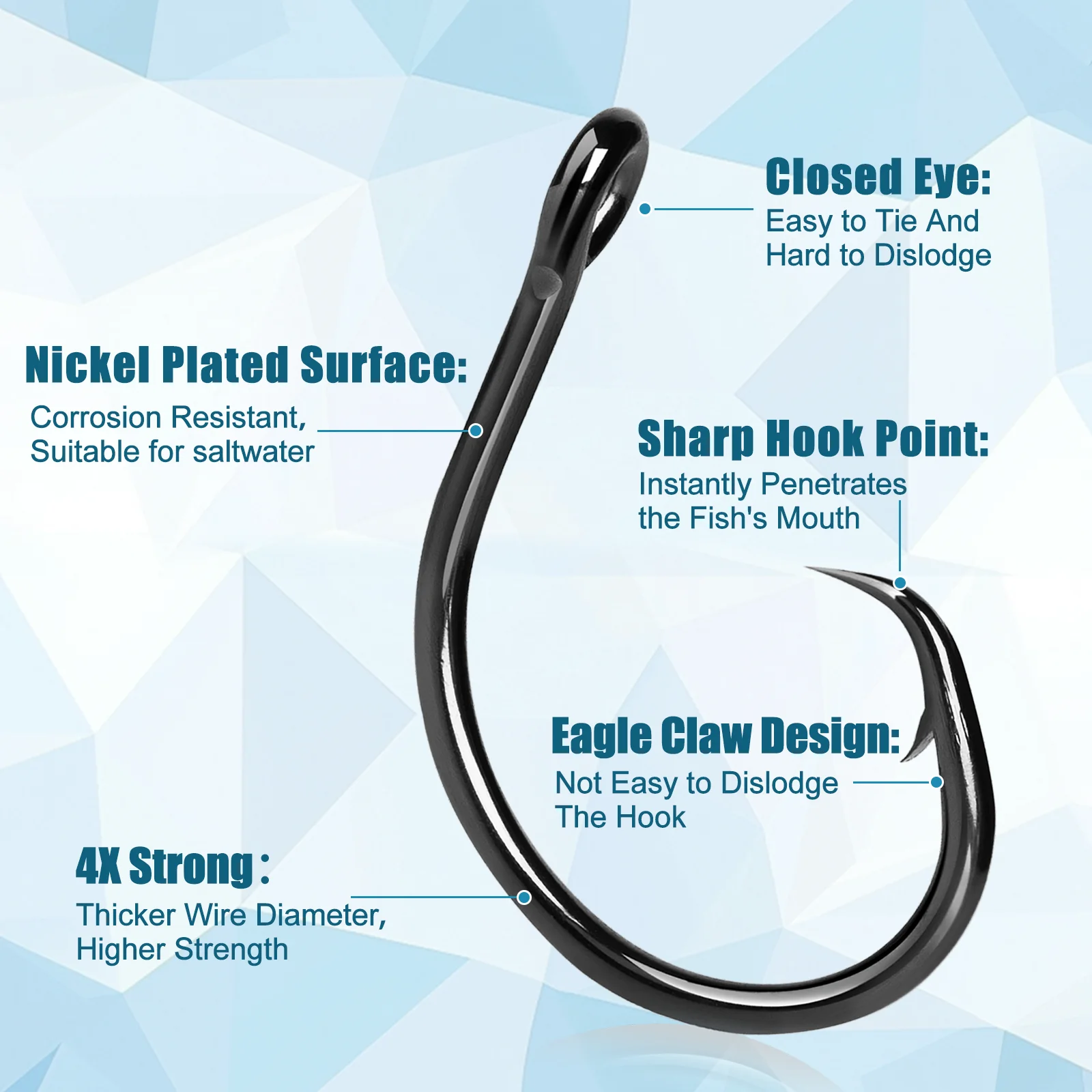 Fabricado con acero de alto carbono de primera calidad con excepcional resistencia a la tracción para una máxima durabilidad.El niquelado mejora la resistencia a la corrosión, lo que hace que estos anzuelos sean ideales tanto para la pesca en agua dulce como en agua salada.