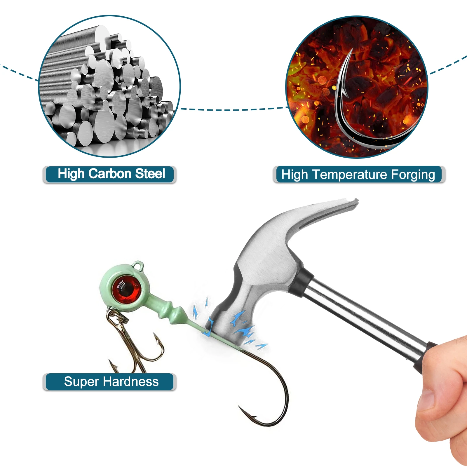 Los anzuelos helicoidales Swimbait de acero con alto contenido de carbono de primera calidad son extremadamente afilados para una penetración rápida y súper fuertes para resistir la flexión.